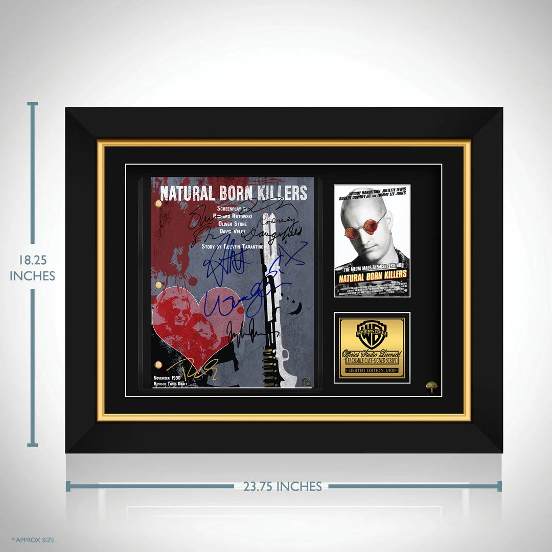 Pay homage to Natural Born Killers , with this Warner Bros fully licensed facsimile of the official signed movie script, originally signed by actors Oliver Stone, Quentin Tarantino, Woody Harrelson, Juliette Lewis, Tom Sizemore, Rodney Dangerfield, Robert Downey Jr & Tommy Lee Jones , of which is strictly limited to 100 units Worldwide and has been approved and numbered accordingly.