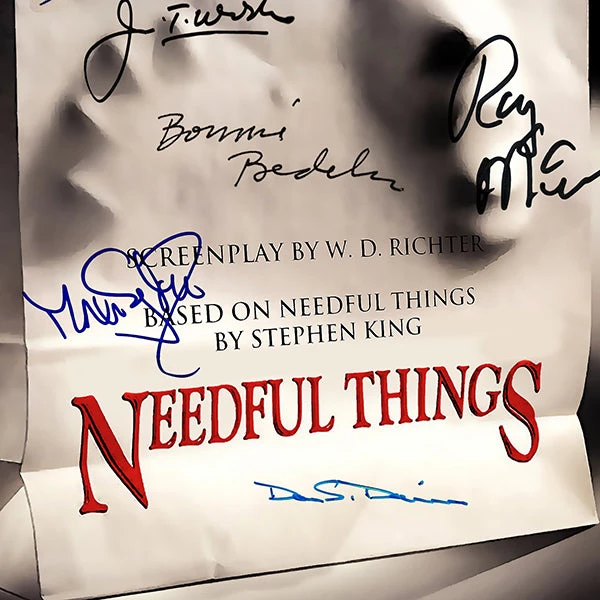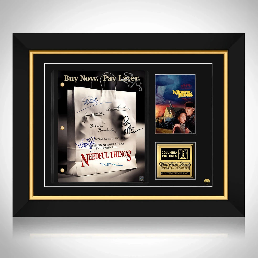 Pay homage to Needful Things 1993 , with this Columbia Pictures fully licensed facsimile of the official signed movie transcript, originally signed by actors Stephen King, Max Von Sydow, Ed Harris, Bonnie Bedelia, J.T. Walsh, Amanda Plummer, Ray McKinnon & Don S. Davis , of which is strictly limited to 100 units Worldwide and has been approved and numbered accordingly.