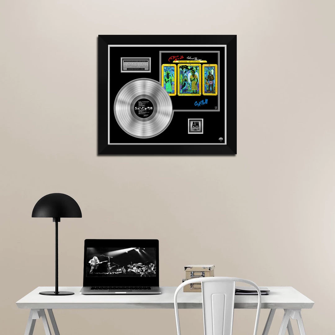 The Platinum Plated LP and album cover facsimile are both professionally mounted in the highest quality triple matted wood shadow box frame with metallic fillet trim and finished with protective glass to keep it looking pristine. The customized descriptive metallic plaque, in addition to the detailed finishing and openings, add to the elegant and sophisticated gallery quality look.