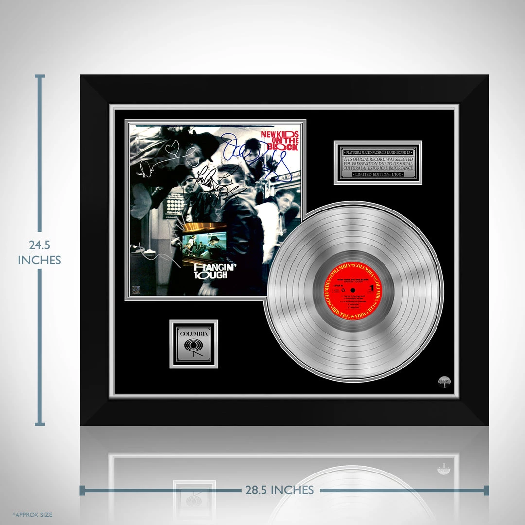 Pay homage to one of the most iconic boy band of all time New kids on the block , with this gallery-framed, authentic Columbia Records fully licensed facsimile of the official Hand-Signed Platinum Plated LP Record and LP Cover Hangin’ Tough Originally signed by Jordan Knight, Donnie Wahlberg, Jonathan Knight, Danny Wood & Joey McIntyre , of which is strictly limited to 100 units Worldwide and has been approved and numbered accordingly.