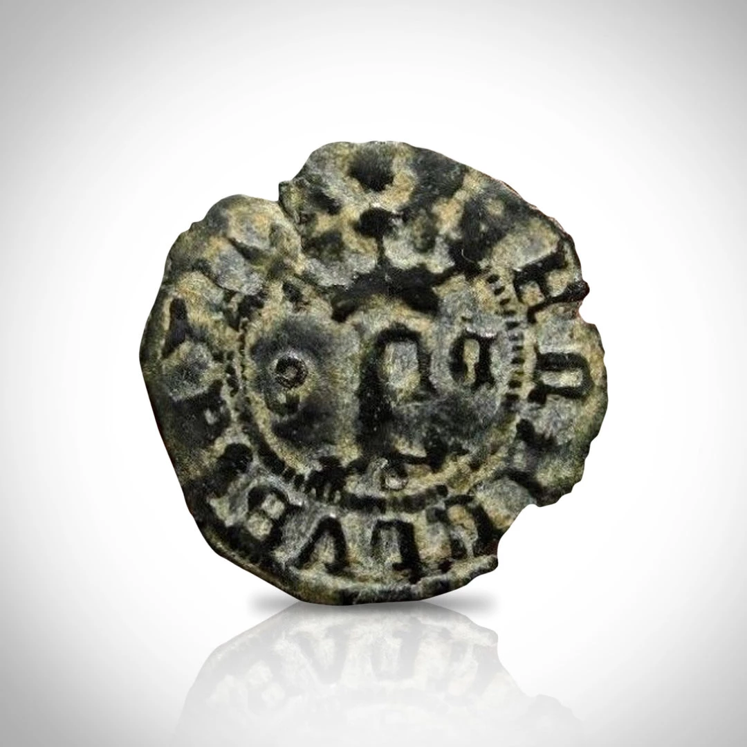 This custom museum display showcases an Authentic King Ferdinand II & Queen Isabella I, billon ‘NEW WORLD – FIRST COIN OF THE AMERICAS’ dating from 1492 AD.