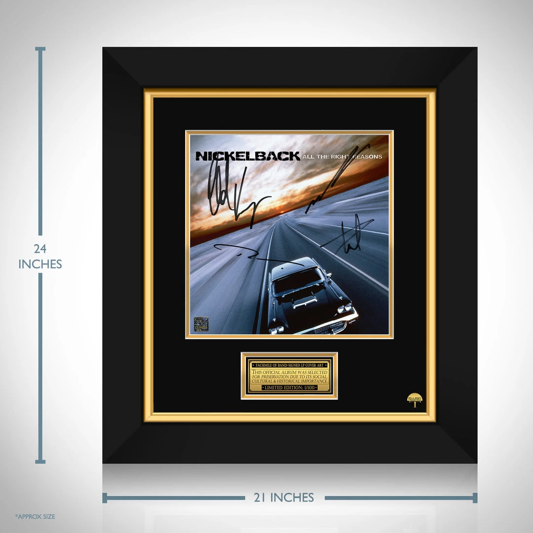 Pay homage to one of the most iconic Canadian rock band of all time, Nickelback , with this gallery-framed, officially licensed, limited edition facsimile of the Hand-Signed All the right reason LP Cover originally signed by Chad Kroeger, Ryan Peake, Mike Kroeger & Daniel Adair , of which is strictly limited to 100 units Worldwide, and has been approved and numbered accordingly.