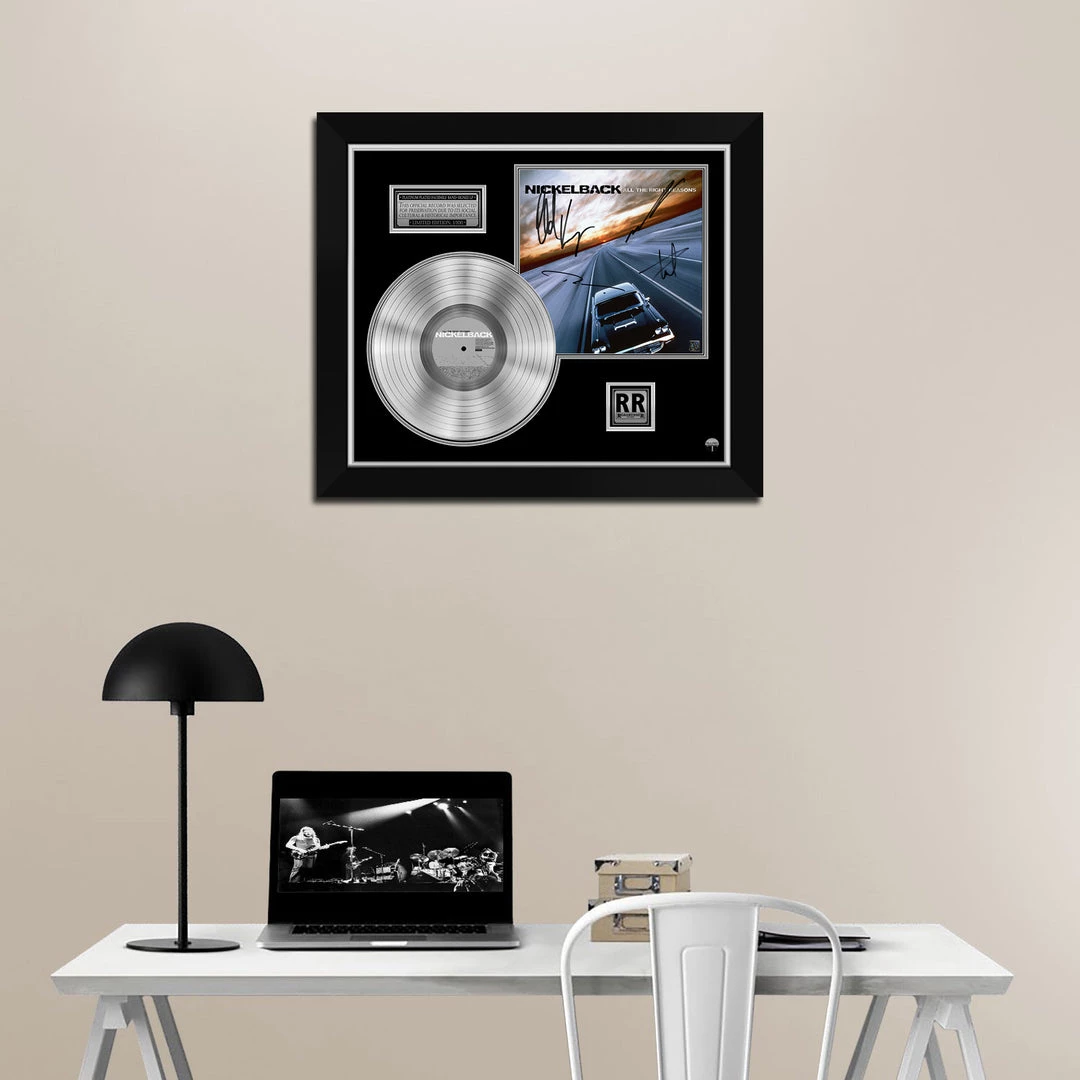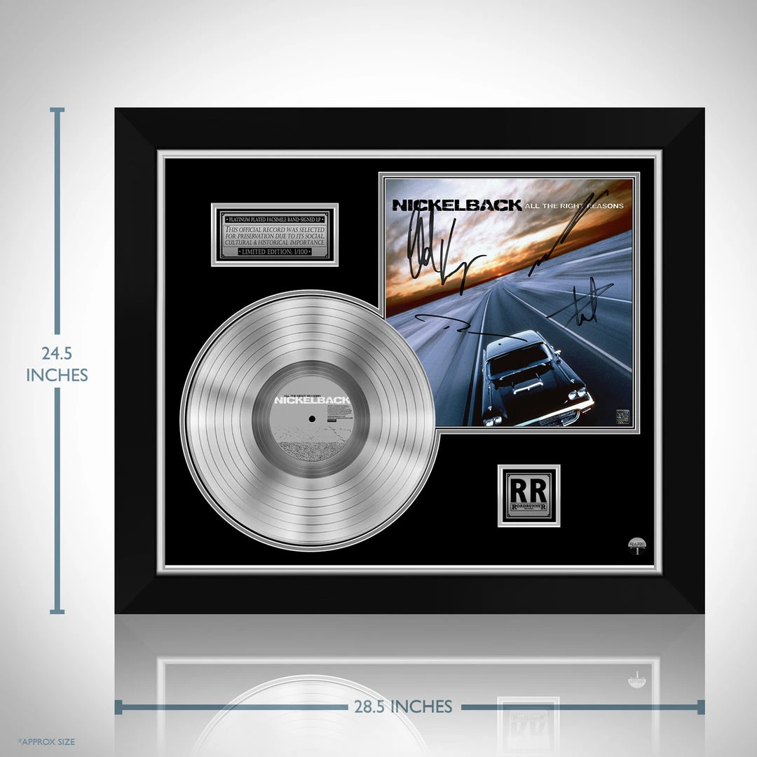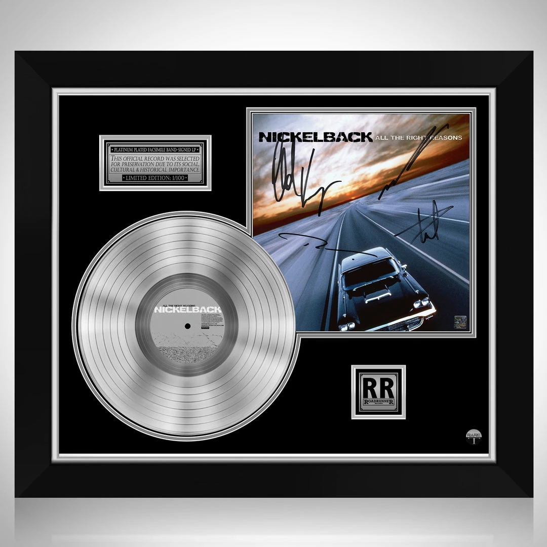 Pay homage to one of the most iconic Canadian rock band of all time Nickelback , with this gallery-framed, authentic Roadrunner Records fully licensed facsimile of the official Hand-Signed Platinum Plated LP Record and LP Cover All the right reason Originally signed by Chad Kroeger, Ryan Peake, Mike Kroeger & Daniel Adair , of which is strictly limited to 100 units Worldwide and has been approved and numbered accordingly.