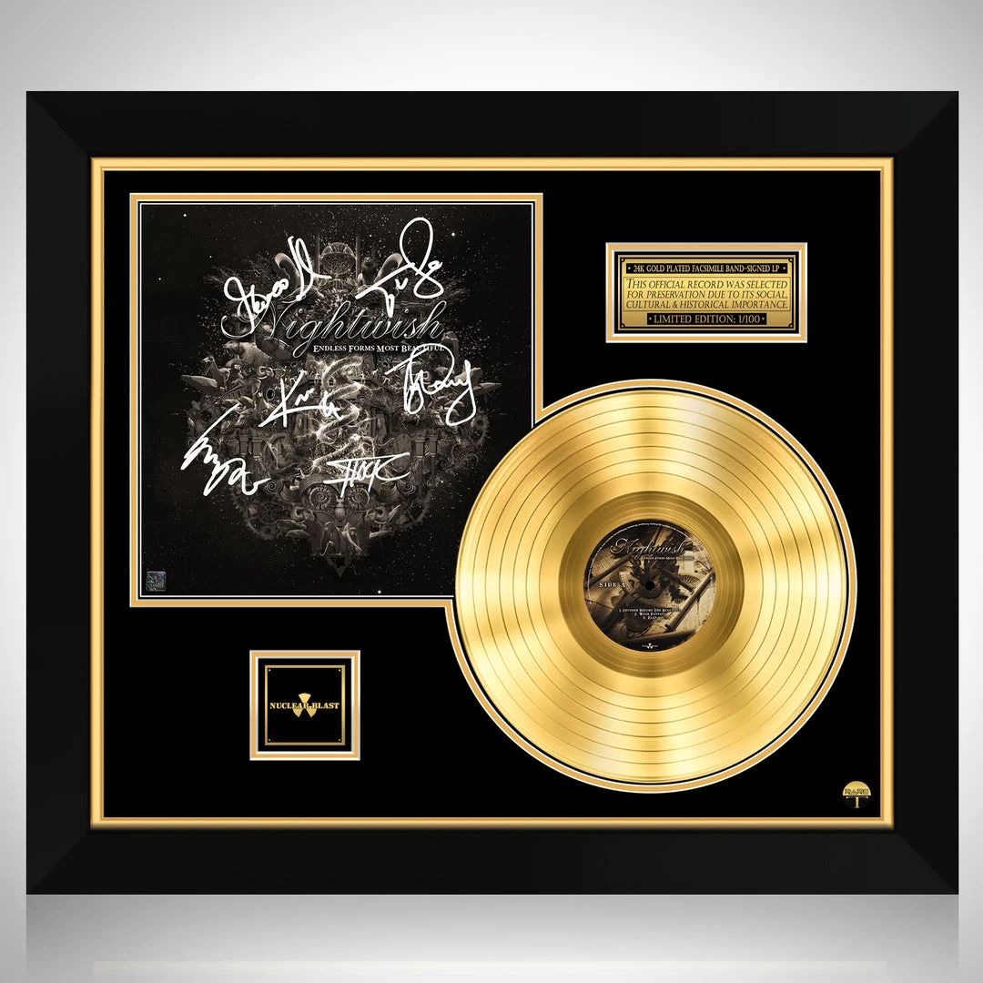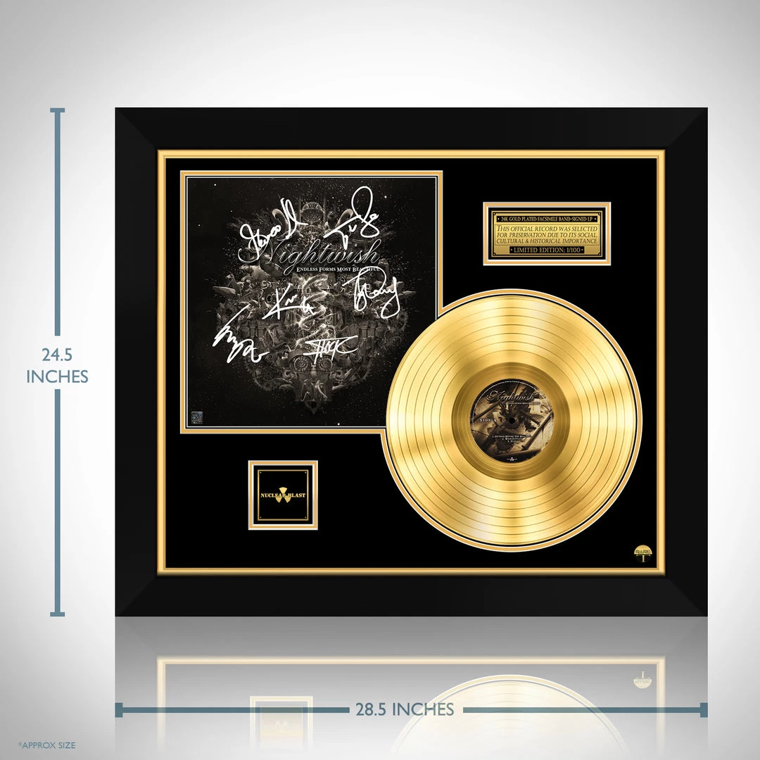 Pay homage to one of the most iconic Finnish symphonic metal band of all time Nightwish , with this gallery-framed, authentic Nuclear Blast fully licensed facsimile of the official Hand-Signed 24K Gold Plated LP Record and LP Coverย Endless Forms Most Beautiful Originally signed by Floor Jansen, Emppu Vuorinen, Marko Hietala, Tuomas Holopainen, Troy Donockley & Kai Hahto , of which is strictly limited to 100 units Worldwide and has been approved and numbered accordingly.