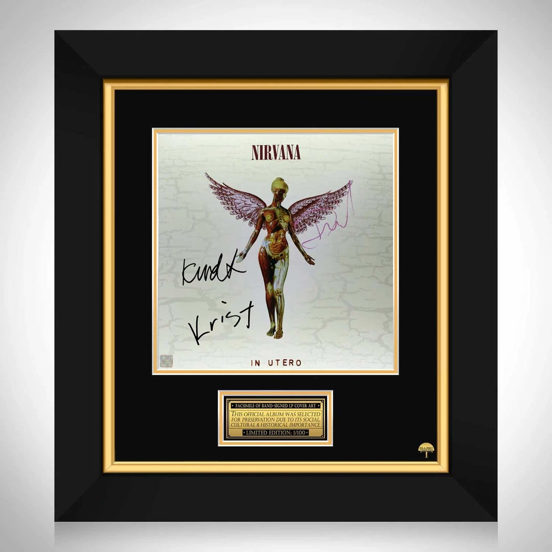 Pay homage to one of the most influential grunge-alternative rock bands of all time, Nirvana, with this gallery-framed, officially licensed, limited edition facsimile of the Hand-Signed IN UTERO LP Cover originally signed by band members, bassist Krist Novoselic, drummer David Grohl & the legendary, late Kurt Cobain, of which is strictly limited to 100 units Worldwide, and has been approved and numbered accordingly.