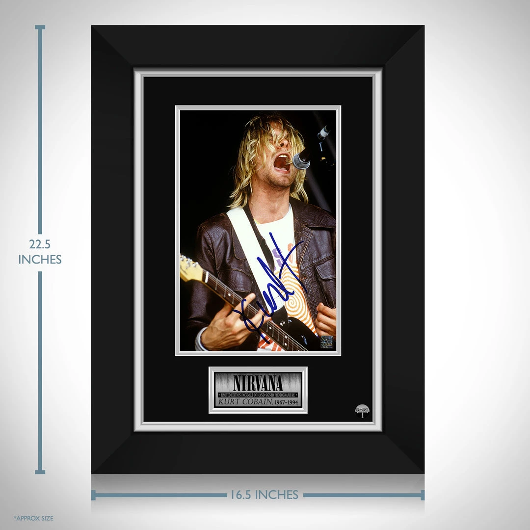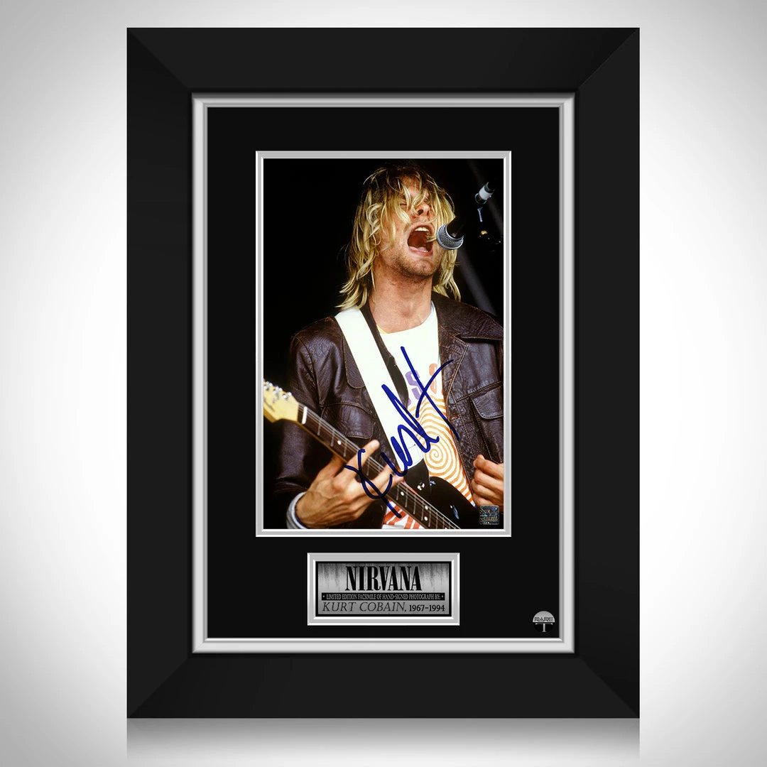 Pay homage to Nirvanaย with this gallery-framed, officially licensed, limited edition facsimile of hand-signed photo, originally signed by Kurt Cobain, of which is strictly limited to 100 units Worldwide, and has been approved and numbered accordingly.