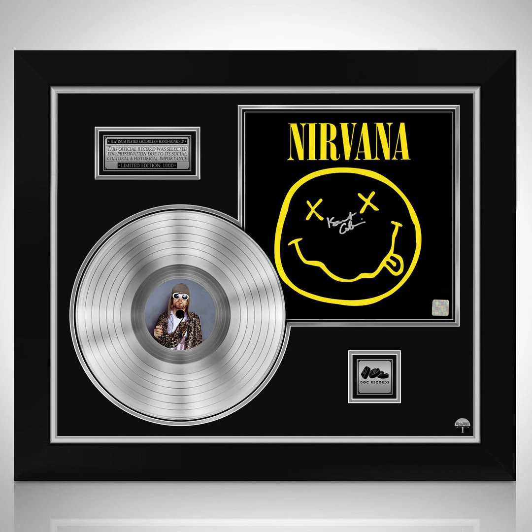 Pay homage to one of the most influential grunge-alternative rock bands of all time, Nirvana, with this gallery-framed, authentic, DGC Records fully licensed facsimile of the official Hand-Signed Platinum Plated LP Record and Smiley Face Commemorative LP Cover, originally signed by the legendary, late Kurt Cobain, of which is strictly limited to 100 units Worldwide and has been approved and numbered accordingly.