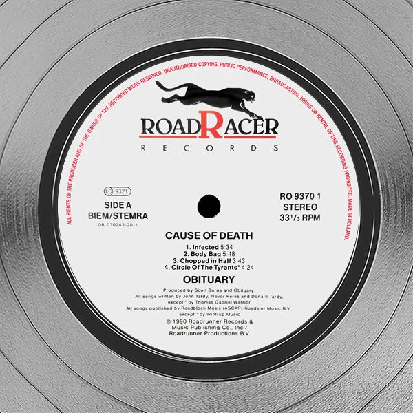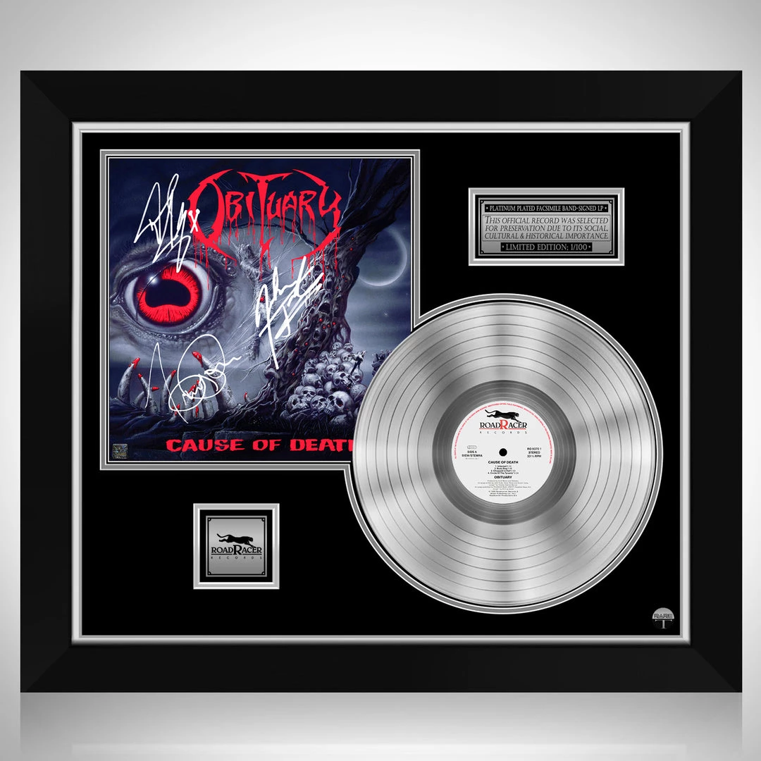 Pay homage to one of the most iconic American death metal band of all time Obituary , with this gallery-framed, authentic Roadracer Records fully licensed facsimile of the official Hand-Signed Platinum Plated LP Record and LP Cover Cause of Death Originally signed by John Tardy, Tervor Peres & Donald Tardy , of which is strictly limited to 100 units Worldwide and has been approved and numbered accordingly.