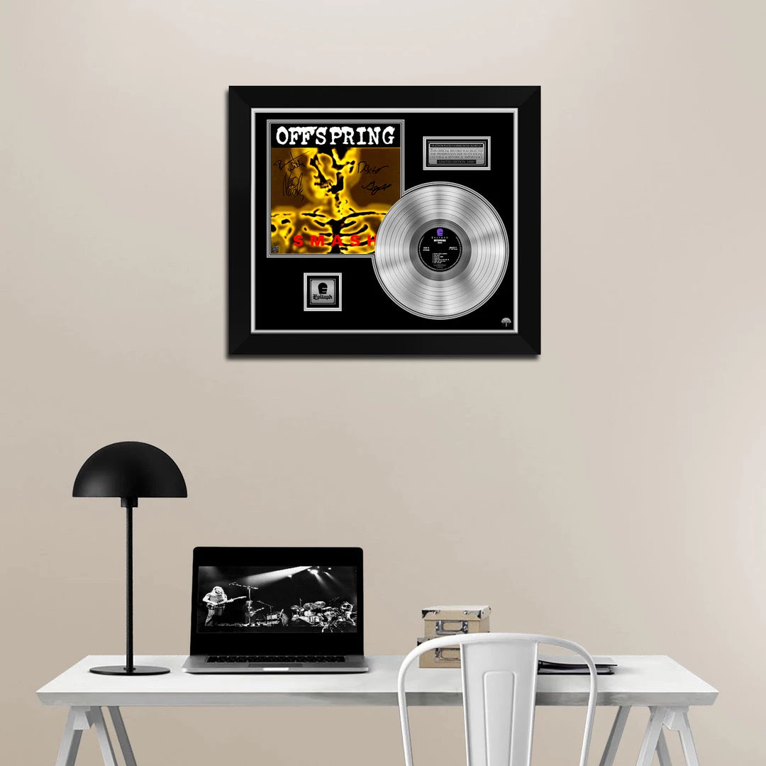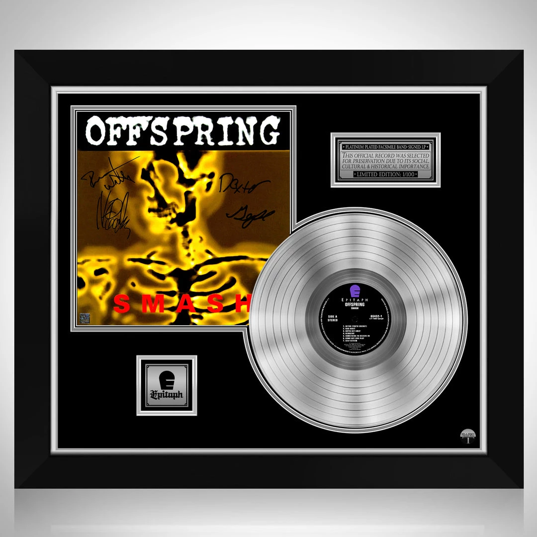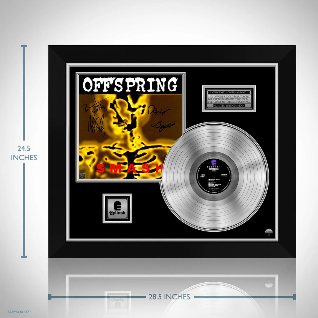 Pay homage to one of the most iconic American rock band of all time Offspring , with this gallery-framed, authentic Epitaph records fully licensed facsimile of the official Hand-Signed Platinum Plated LP Record and LP Cover Smash Originally signed by Greg K., Dexter Holland, Noodles & Ron Welty , of which is strictly limited to 100 units Worldwide and has been approved and numbered accordingly.