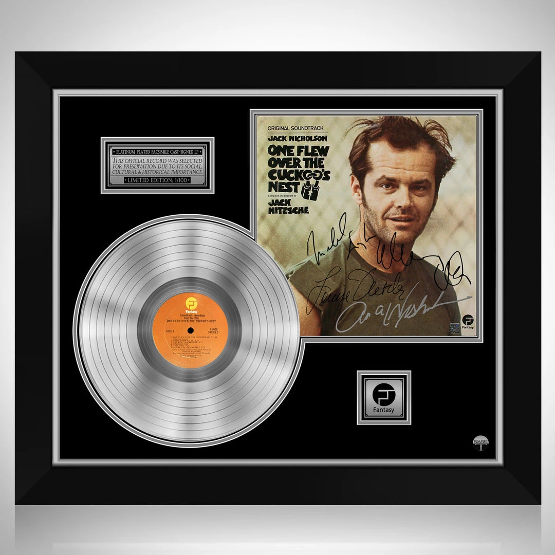 Pay homage to one of the most iconic movie of all time One Flew Over The Cuckoos Nest , with this gallery-framed, authentic Fantasy fully licensed facsimile of the official Hand-Signed Platinum Plated LP Record and EP Cover soundtrack Originally signed by Michael Douglas, Jack Nicholson, Will Sampson, Danny DeVito, & Christopher Lloyd , of which is strictly limited to 100 units Worldwide and has been approved and numbered accordingly.