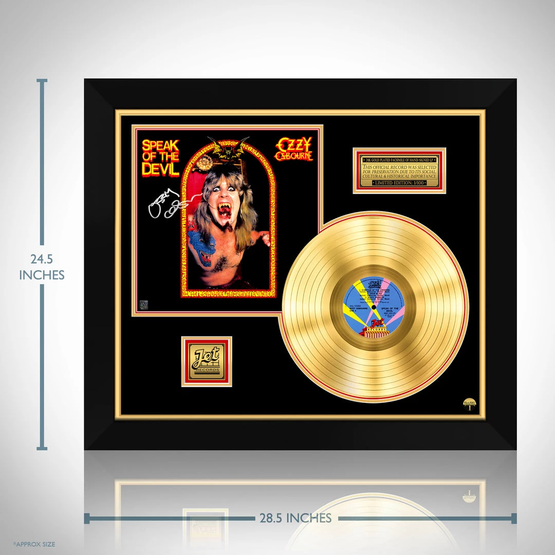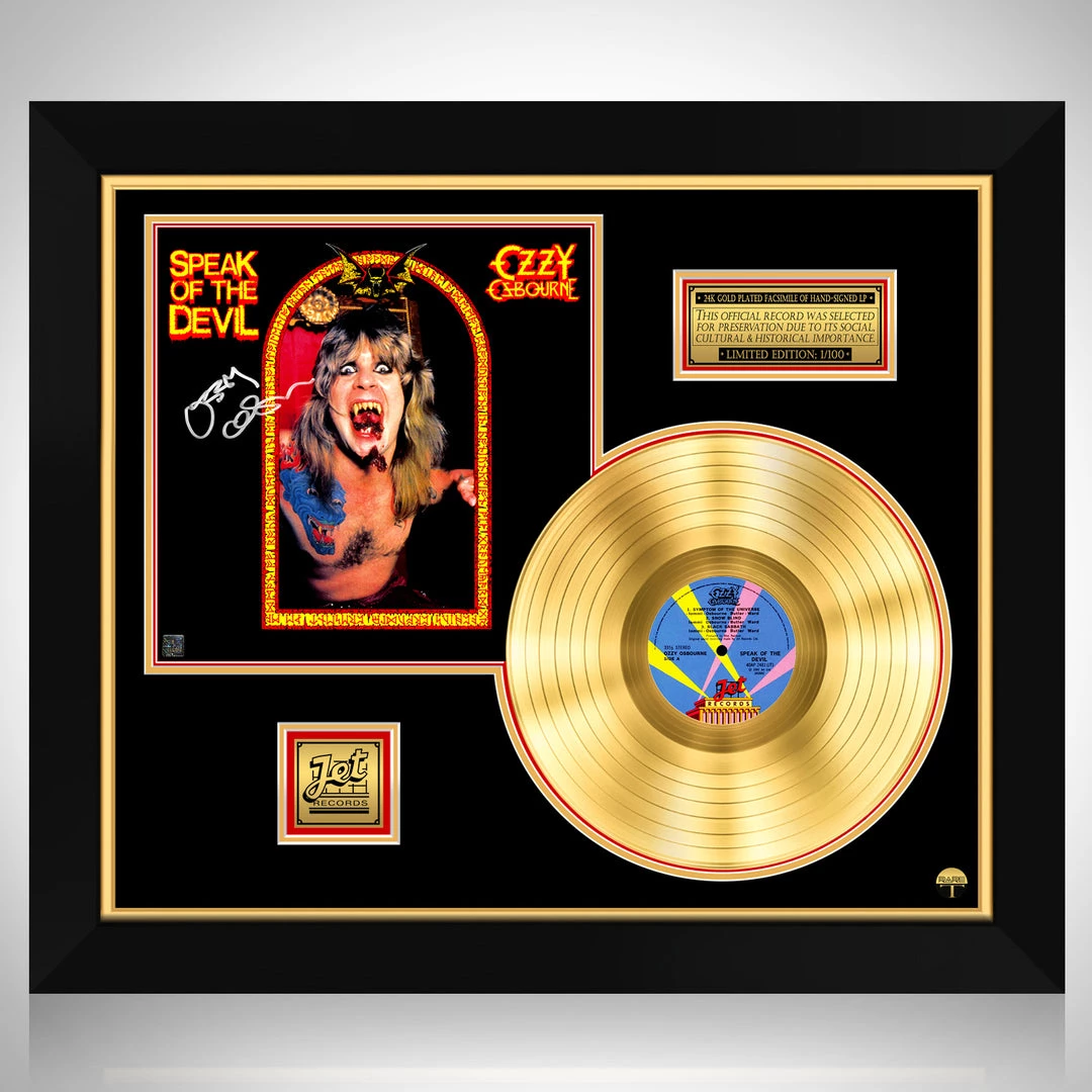 Pay homage to The Prince of Darkness, Ozzy Osbourne, with this gallery-framed, authentic, Jet Records fully licensed facsimile of the official Hand-Signedย Platinum Plated LP Record and LP Cover Speak of the Devil, originally signed by Ozzy Osbourne, of which is strictly limited to 100 units Worldwide, and has been approved and numbered accordingly.