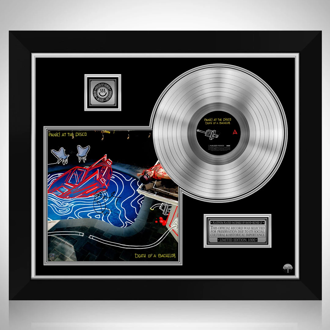 Pay homage to one of the most iconic American musician of all time Panic at the Disco , with this gallery-framed, authentic Fueled by Ramen Records fully licensed facsimile of the official Hand-Signed Platinum Plated LP Record and LP Cover Death by a bachelor Originally signed by Brandon Urie , of which is strictly limited to 100 units Worldwide and has been approved and numbered accordingly.