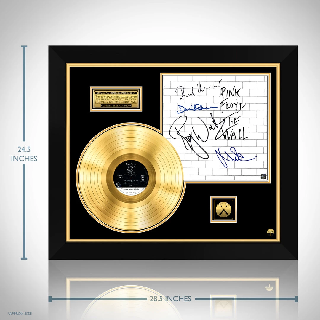 Pay homage to one of the most iconic rock band of all time Pink Floyd , with this gallery-framed, authentic Sony Records fully licensed facsimile of the official Hand-Signed 24K Gold Plated LP Record and LP Cover The Wall Originally signed by Roger Waters, David Gilmour, Nick Mason & Richard Wright , of which is strictly limited to 100 units Worldwide and has been approved and numbered accordingly.