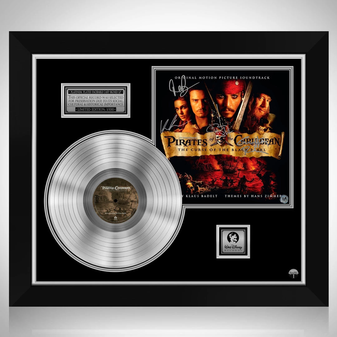 Pay homage to one of the most iconic movie of all time Pirates of The Caribbean The cursed of the Black Pearl , with this gallery-framed, authentic Walt Disney Studios fully licensed facsimile of the official Hand-Signed Platinum Plated LP Record and LP Cover Original Motion Picture Soundtrack Originally signed by Johnny Depp, Geoffrey Rush, Orlando Bloom, Keira Knightley & Hans Zimmer , of which is strictly limited to 100 units Worldwide and has been approved and numbered accordingly.