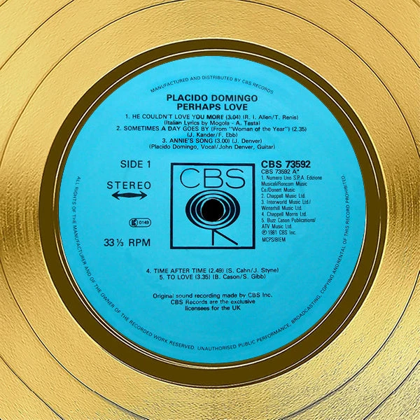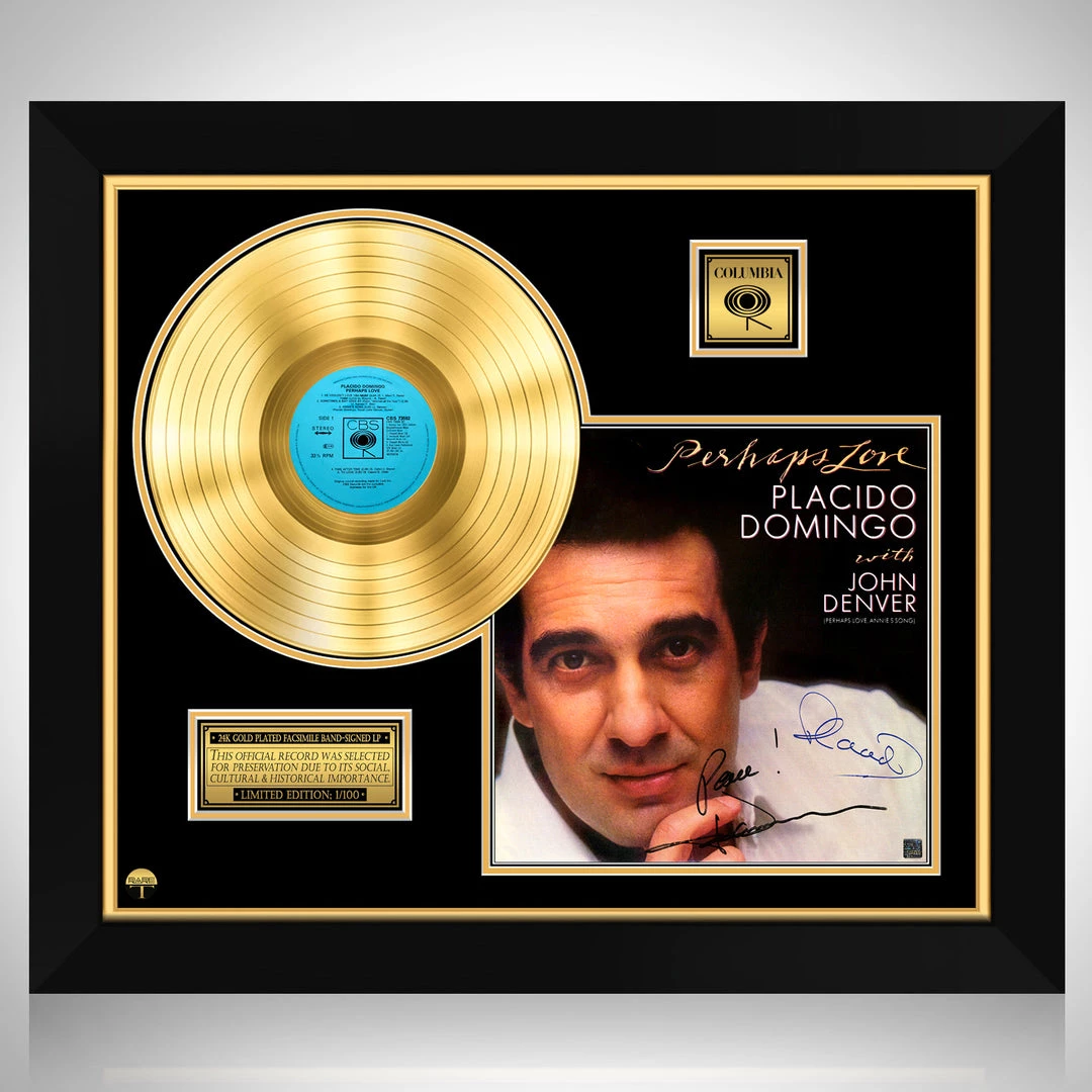 Pay homage to one of the most iconic Spanish opera singer of all time Plácido Domingo with John Denver , with this gallery-framed, authentic Columbia Pictures fully licensed facsimile of the official Hand-Signed 24K Gold LP Record and LP Cover Perhaps Love Originally signed by Plácido Domingo , of which is strictly limited to 100 units Worldwide and has been approved and numbered accordingly.