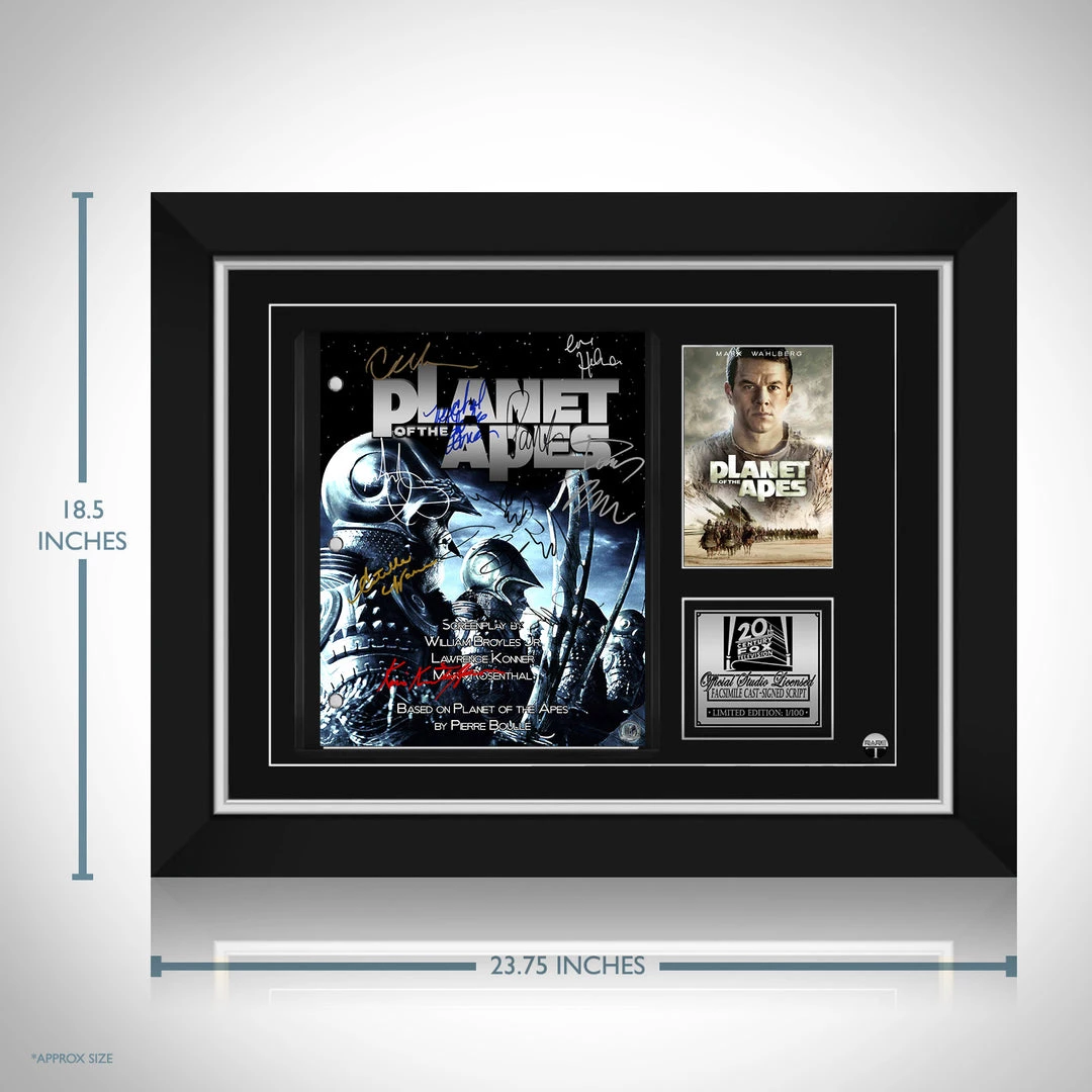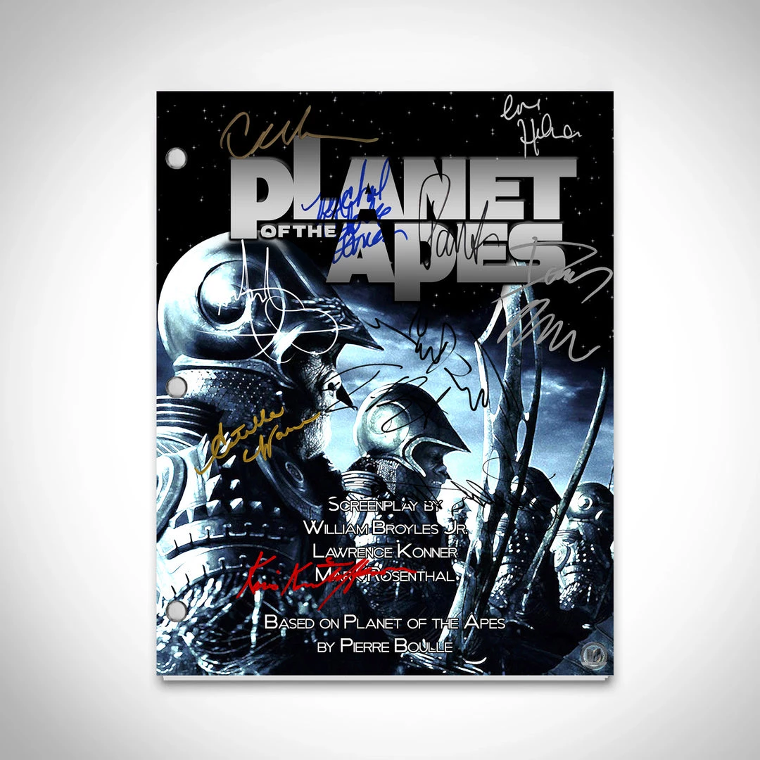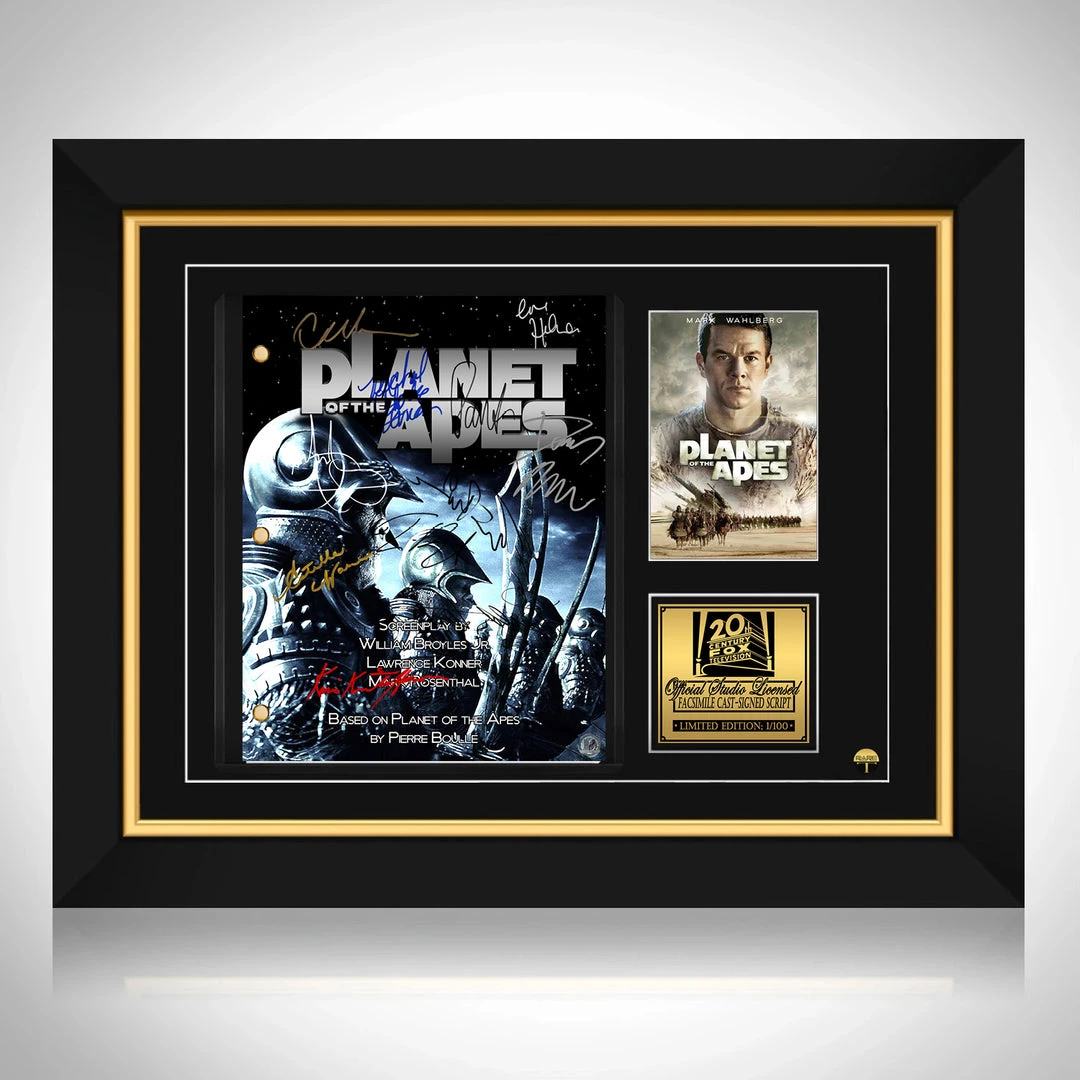 Pay homage to Planet of the Apes 2001 , with this 20th Century Fox fully licensed facsimile of the official signed movie script, originally signed by actors Tim Burton, Mark Wahlberg, Tim Roth, Helena Bonham Carter, Michael Clarke Duncan, Kris Kristofferson, Estella Warren, Paul Giamatti, Danny Elfman, Cary-Hiroyuki Tagawa & Charlton Heston , of which is strictly limited to 100 units Worldwide and has been approved and numbered accordingly.