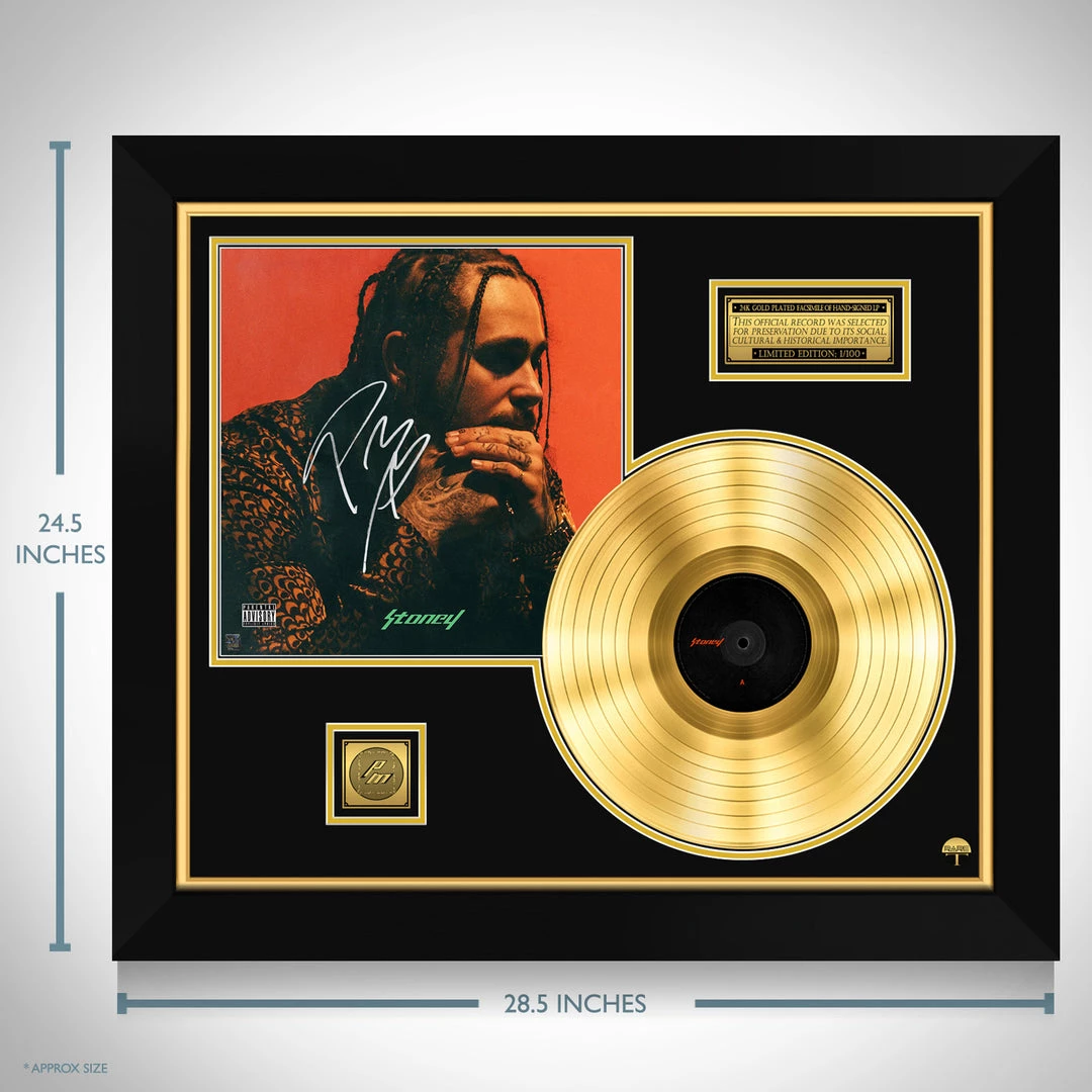 Pay homage to one of the most successful, popular and influential musical artist of all time Post Malone, with this gallery-framed, authentic, Republic Records fully licensed facsimile of hand-signed 24K Gold Plated LP Record and LP Cover Stoney, originally signed by Post Malone, of which is strictly limited to 100 units Worldwide, and has been approved and numbered accordingly.