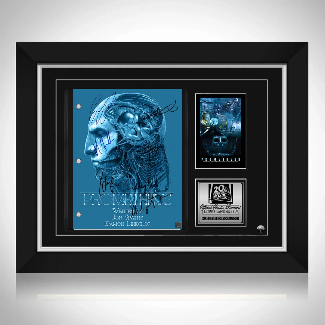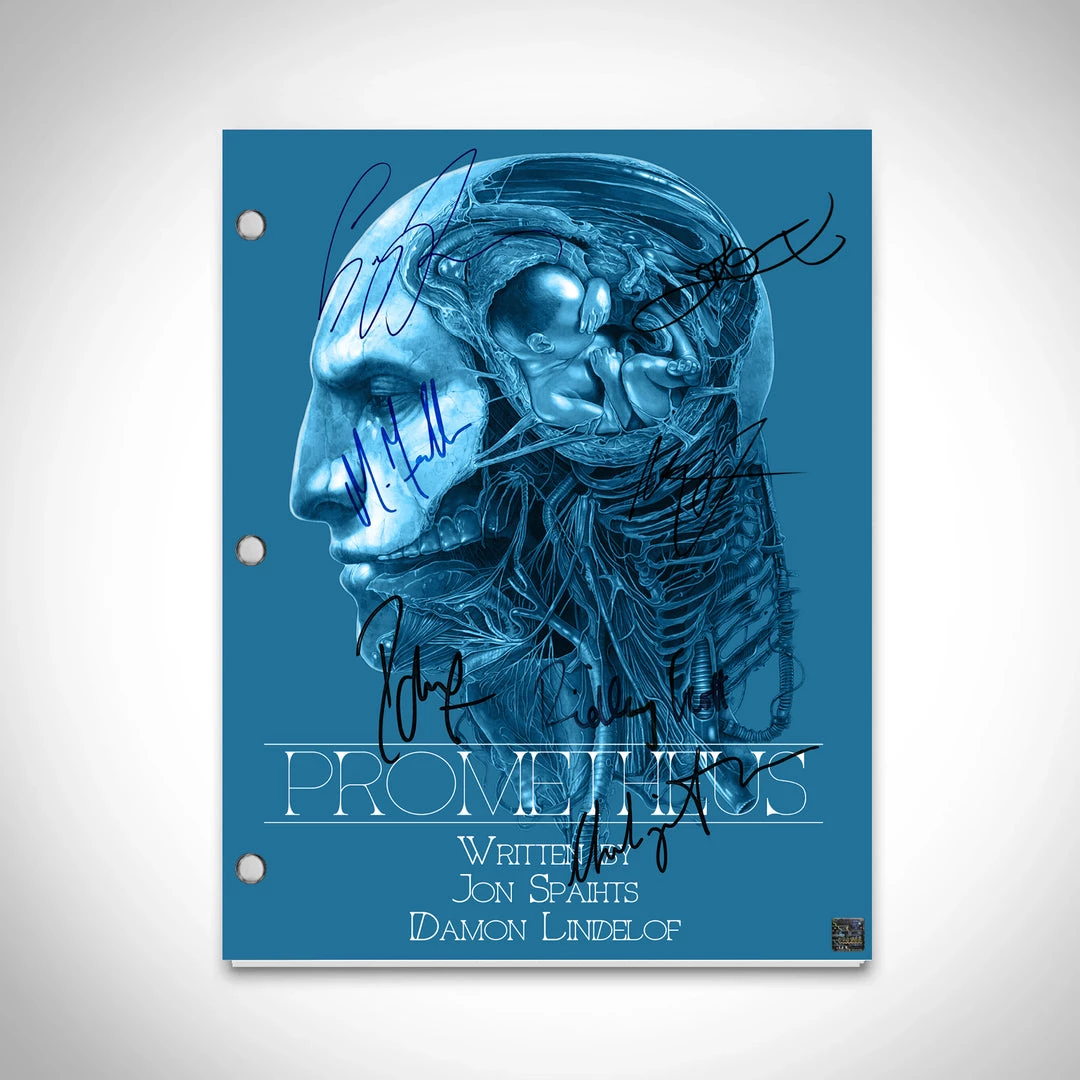 Pay homage to Prometheus , with this 20th Century Fox fully licensed facsimile of the official signed movie script, originally signed by actors Noomi Rapace, Michael Fassbender, Guy Pearce, Idris Elba, Logan Marshall-Green, Charlize Theron & Ridley Scott , of which is strictly limited to 100 units Worldwide and has been approved and numbered accordingly.