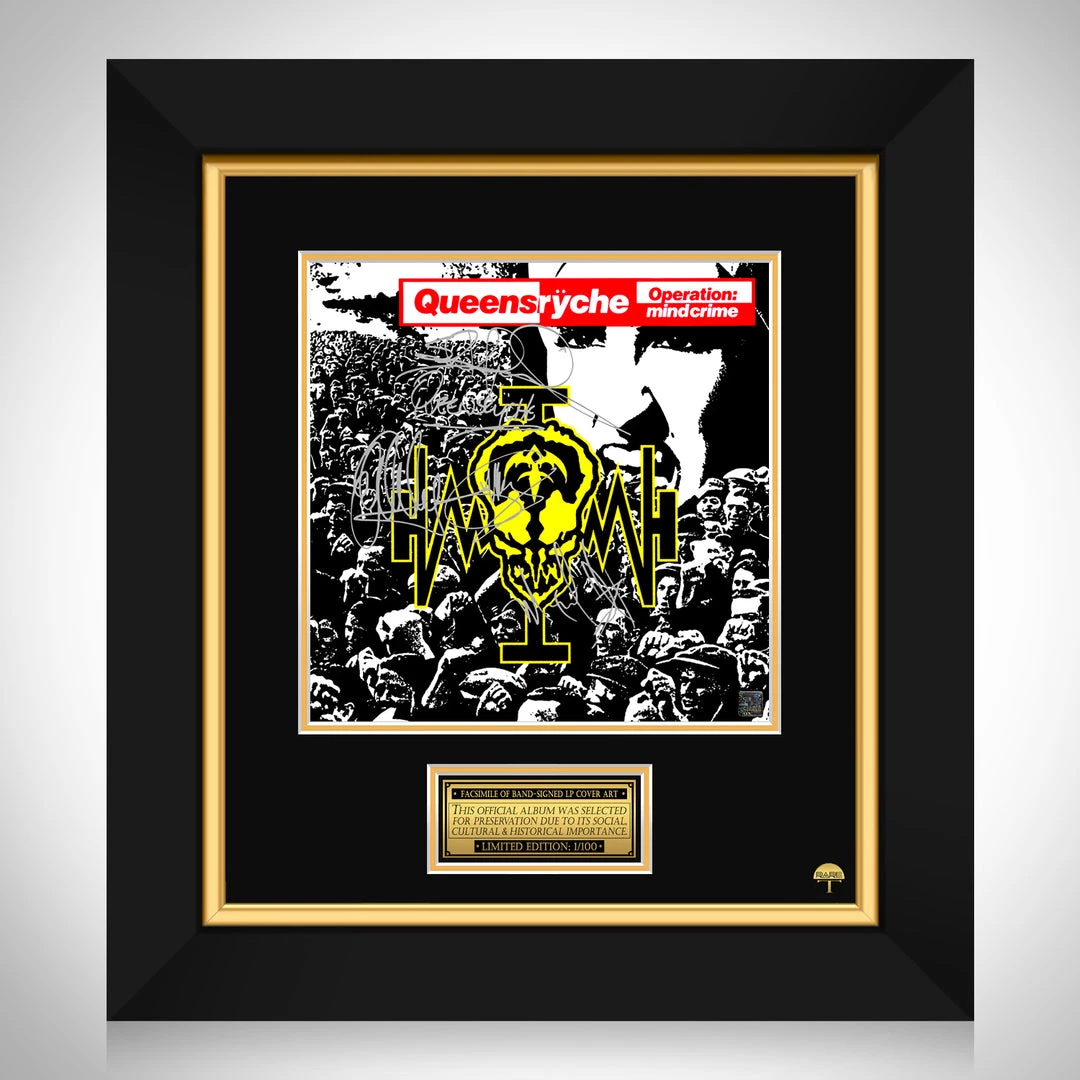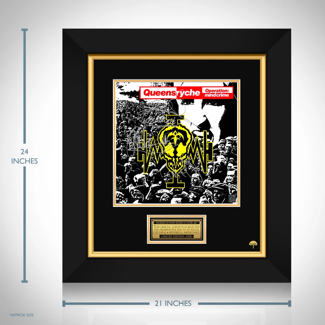 Pay homage to one of the most iconic American heavy metal band of all time, Queensryche , with this gallery-framed, officially licensed, limited edition facsimile of the Hand-Signed Operation: Mindcrime LP Cover originally signed by Geoff Tate, Eddie Jackson, Micheal Wilton & Scott Rockenfield , of which is strictly limited to 100 units Worldwide, and has been approved and numbered accordingly.