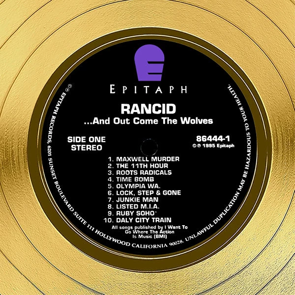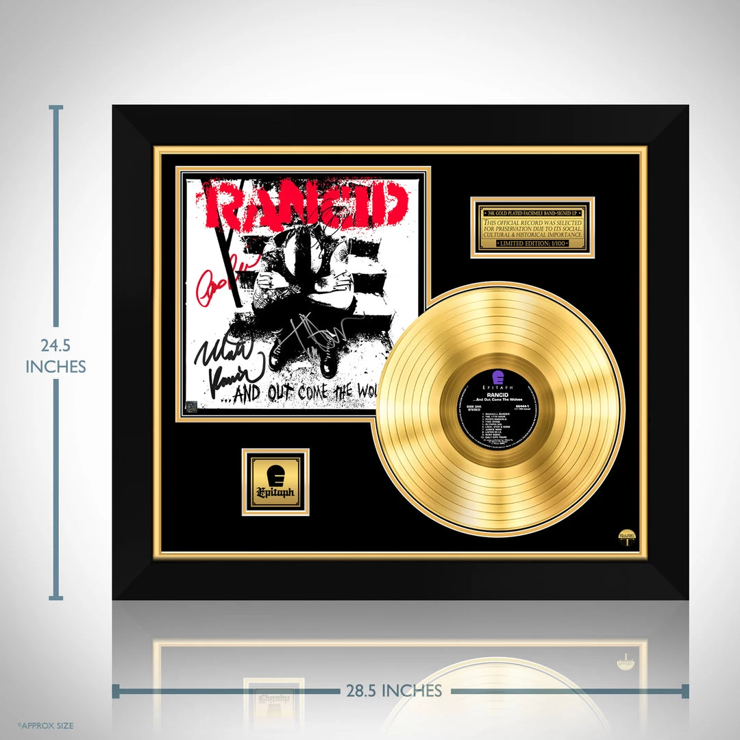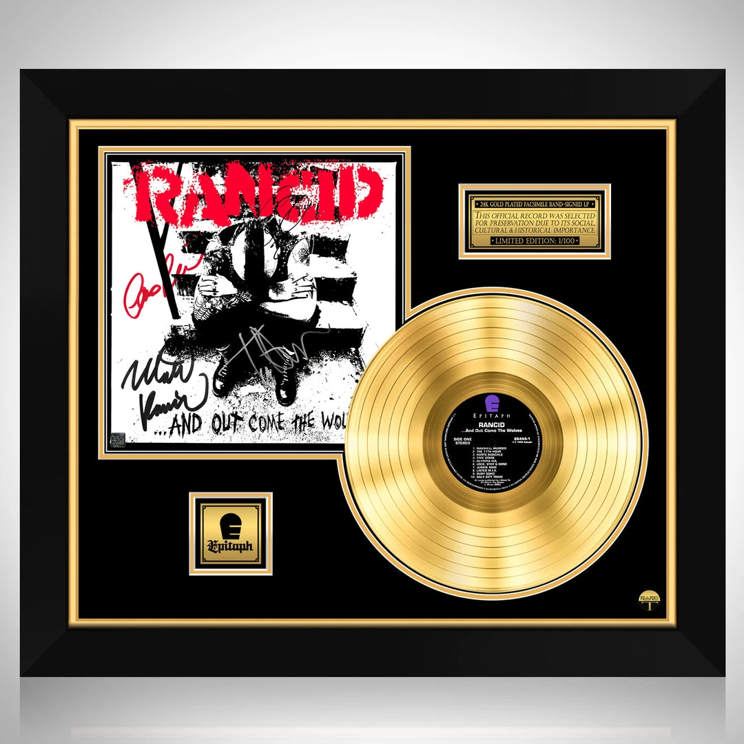 Pay homage to one of the most iconic American Punk rock band of all time Rancid , with this gallery-framed, authentic Epitaph Records fully licensed facsimile of the official Hand-Signed 24K Gold LP Record and LP Cover And out come the wolves Originally signed by Tim Armstrong, Matt Freeman, Lars Frederiksen & Brett Reed , of which is strictly limited to 100 units Worldwide and has been approved and numbered accordingly.