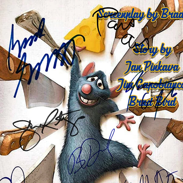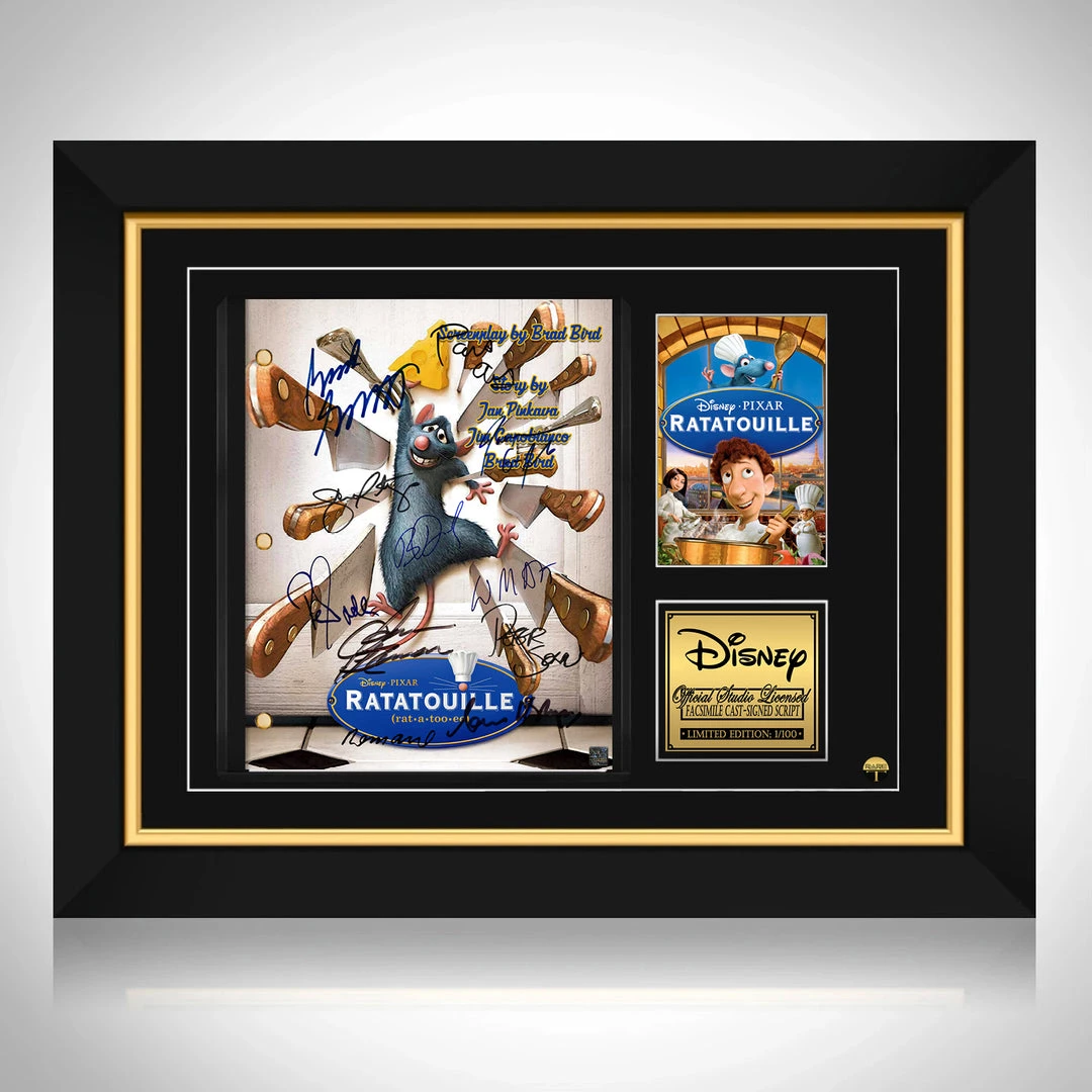 Pay homage to Ratatouille , with this Walt Disney Studio fully licensed facsimile of the official signed movie script, originally signed by actors Patton Oswalt, Ian Holm, Lou Romano, Janeane Garofalo, Brad Garrett, Peter OโToole, Brian Dennehy, Peter Sohn, Will Arnett, James Remar & John Ratzenberger , of which is strictly limited to 100 units Worldwide and has been approved and numbered accordingly.