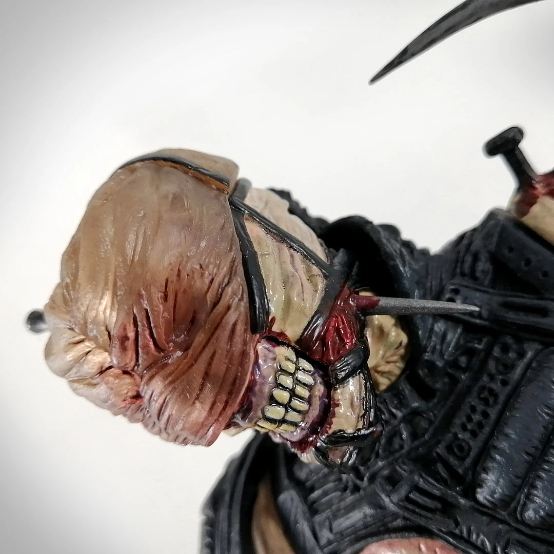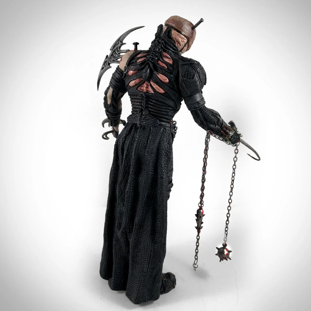 Pay homage to Clive Barker and his Tortured Souls, with this Limited Edition, 12″ Vintage Venal Anatomica Statue. As an assassin, a monster who kills at its master’s command, it has several weapons. Firstly, the hooks embedded in its left hand, and the hook-device strapped to its right and the spiked ball and chain that hangs from it. Secondly, it has a two weapons hanging from its belt – one is another spike/scythe, and the other is more disturbing – a spiked metal phallus.