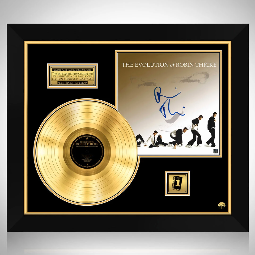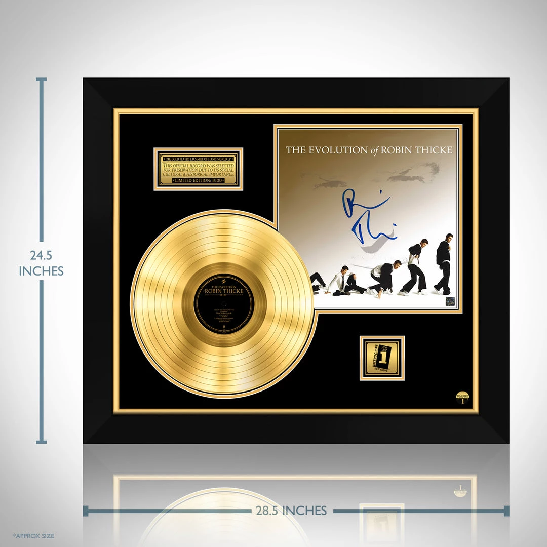 Pay homage to one of the most iconic American singer, songwriter of all time Robin Thicke , with this gallery-framed, authentic Interscope Records fully licensed facsimile of the official Hand-Signed 24K Gold LP Record and LP Cover The evolution of Robin Thicke Originally signed by Robin Thicke , of which is strictly limited to 100 units Worldwide and has been approved and numbered accordingly.