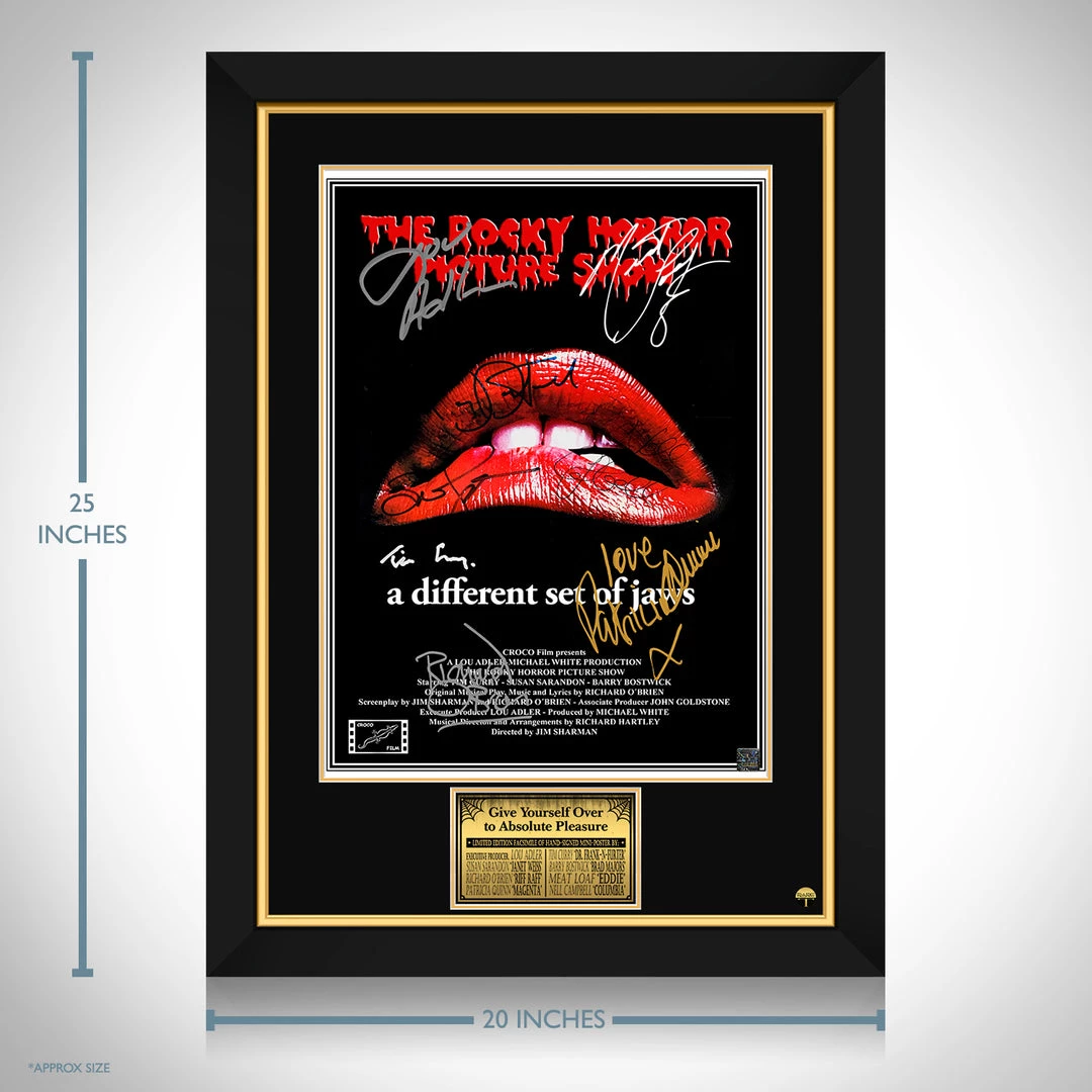 Pay homage to Rocky Horror Picture Show with this gallery-framed, officially licensed, limited edition facsimile of hand-signed mini poster, originally signed by Lou Adler, Susan Sarandon, Richard O’Brien, Patricia Quinn, Tim Curry, Barry, Bostwick, Meat loaf and Nell Campbell, of which is strictly limited to 100 units Worldwide, and has been approved and numbered accordingly.