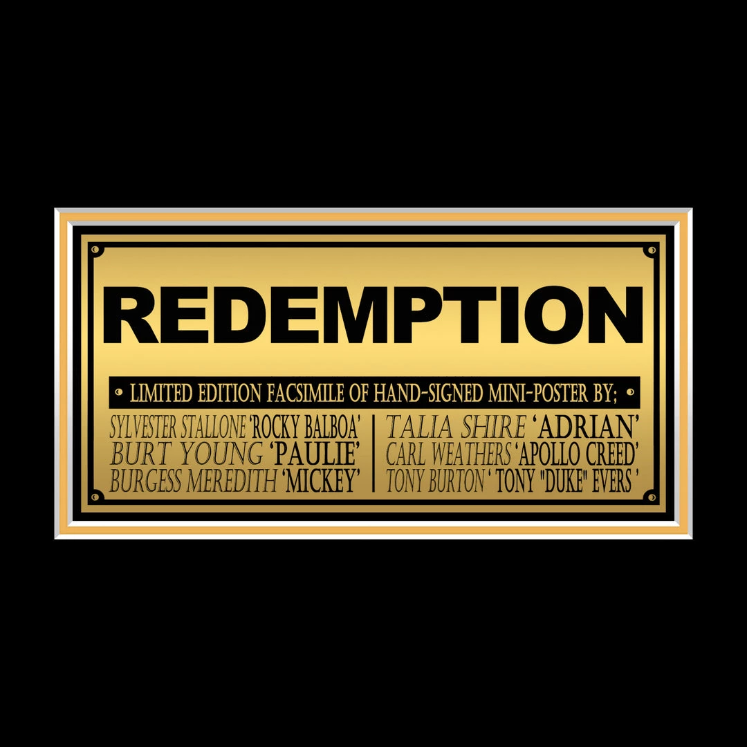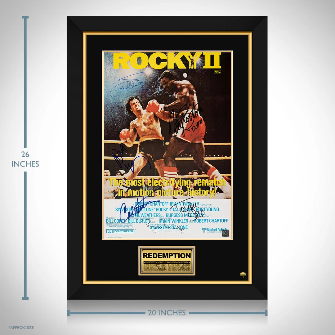 Pay homage to one of the most iconic films of all time, Rocky II, with this gallery-framed, officially licensed, limited edition facsimile of hand-signed movie mini poster, originally signed by Sylvester Stallone, Burt Young, Burgess Meredith, Talia Shire, Carl Weathers and Tony Burton, of which is strictly limited to 100 units Worldwide, and has been approved and numbered accordingly.