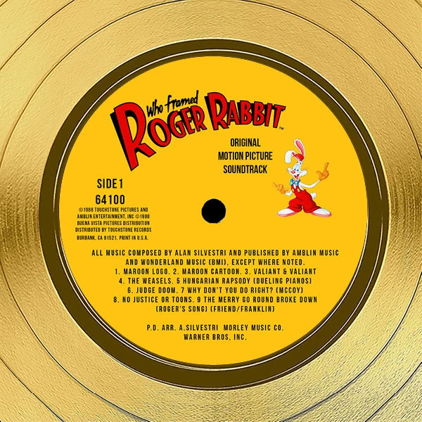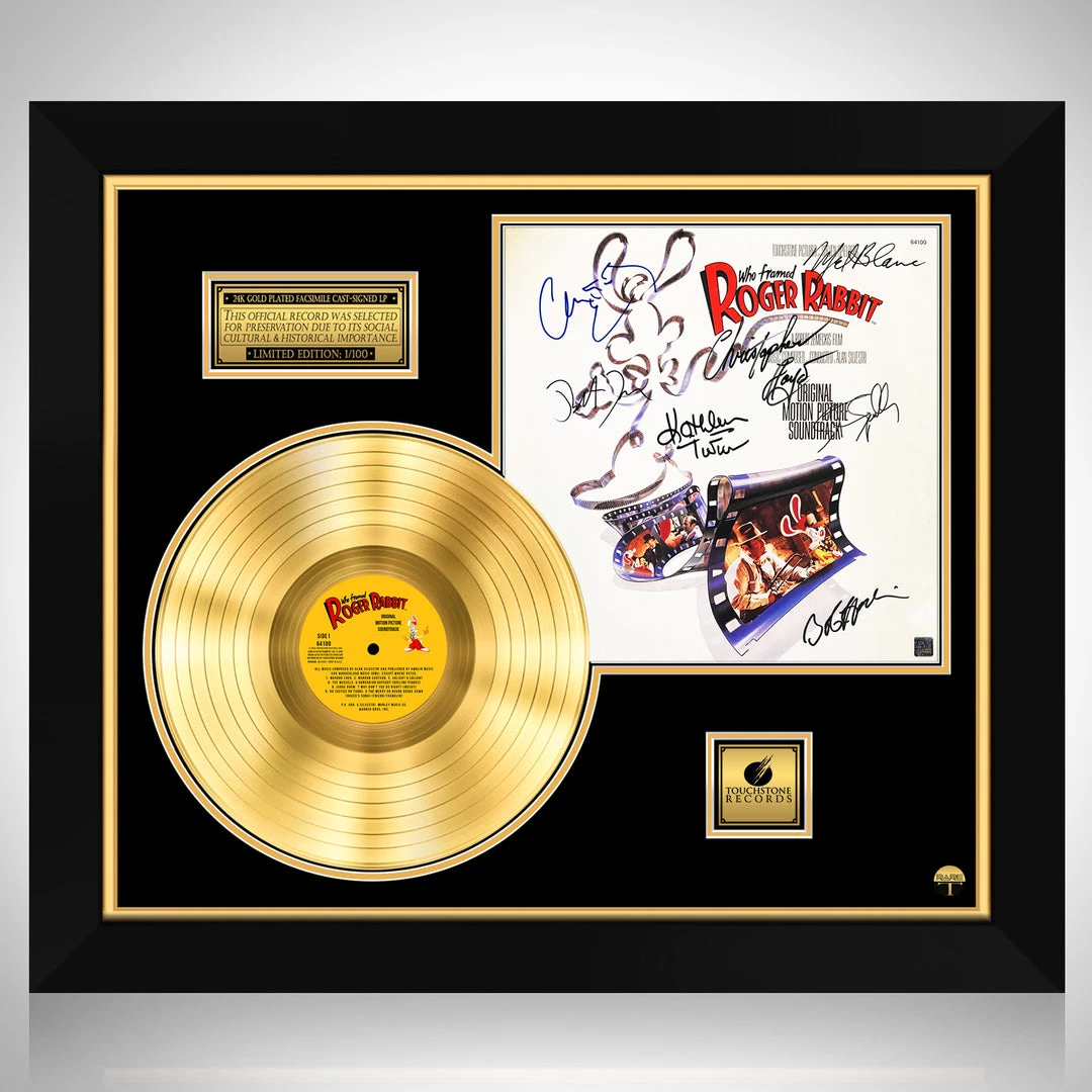 Pay homage to one of the most iconic movie of all time Roger Rabbit , with this gallery-framed, authentic Touchstone Records fully licensed facsimile of the official Hand-Signed 24K Gold LP Record and LP Cover Original Motion Picture Soundtrack Originally signed by Robert Zemeckis, Steven Spielberg, Bob Hoskins, Christopher Lloyd, Charles Fleischer, Mel Blanc & Kathleen Turner , of which is strictly limited to 100 units Worldwide and has been approved and numbered accordingly.