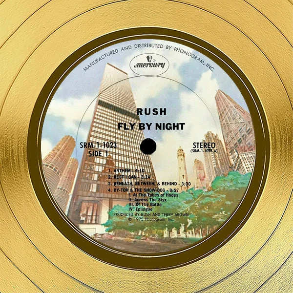 Pay homage to one of the most iconic rock band of all time Rush , with this gallery-framed, authentic Mercury records fully licensed facsimile of the official Hand-Signed 24K Gold LP Record and LP Cover Fly by night Originally signed by Alex Lifeson, Neil Peart and Geddy Lee , of which is strictly limited to 100 units Worldwide and has been approved and numbered accordingly.