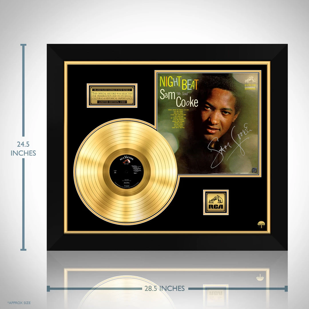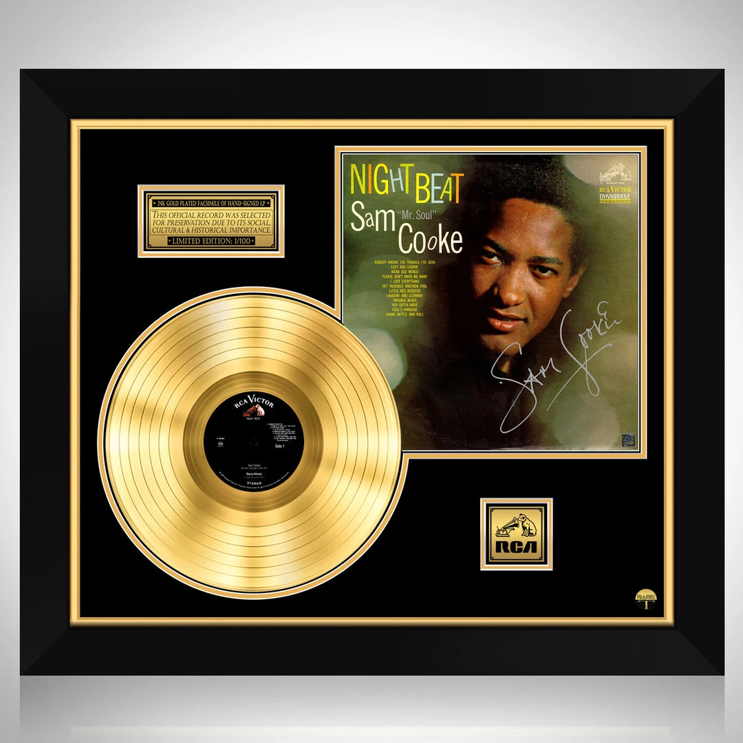 Pay homage to one of the most iconic American singer, songwriter, of all time Sam Cooke , with this gallery-framed, authentic RCA Records fully licensed facsimile of the official Hand-Signed 24K Gold LP Record and LP Cover Night Beat Originally signed by Sam Cooke , of which is strictly limited to 100 units Worldwide and has been approved and numbered accordingly.