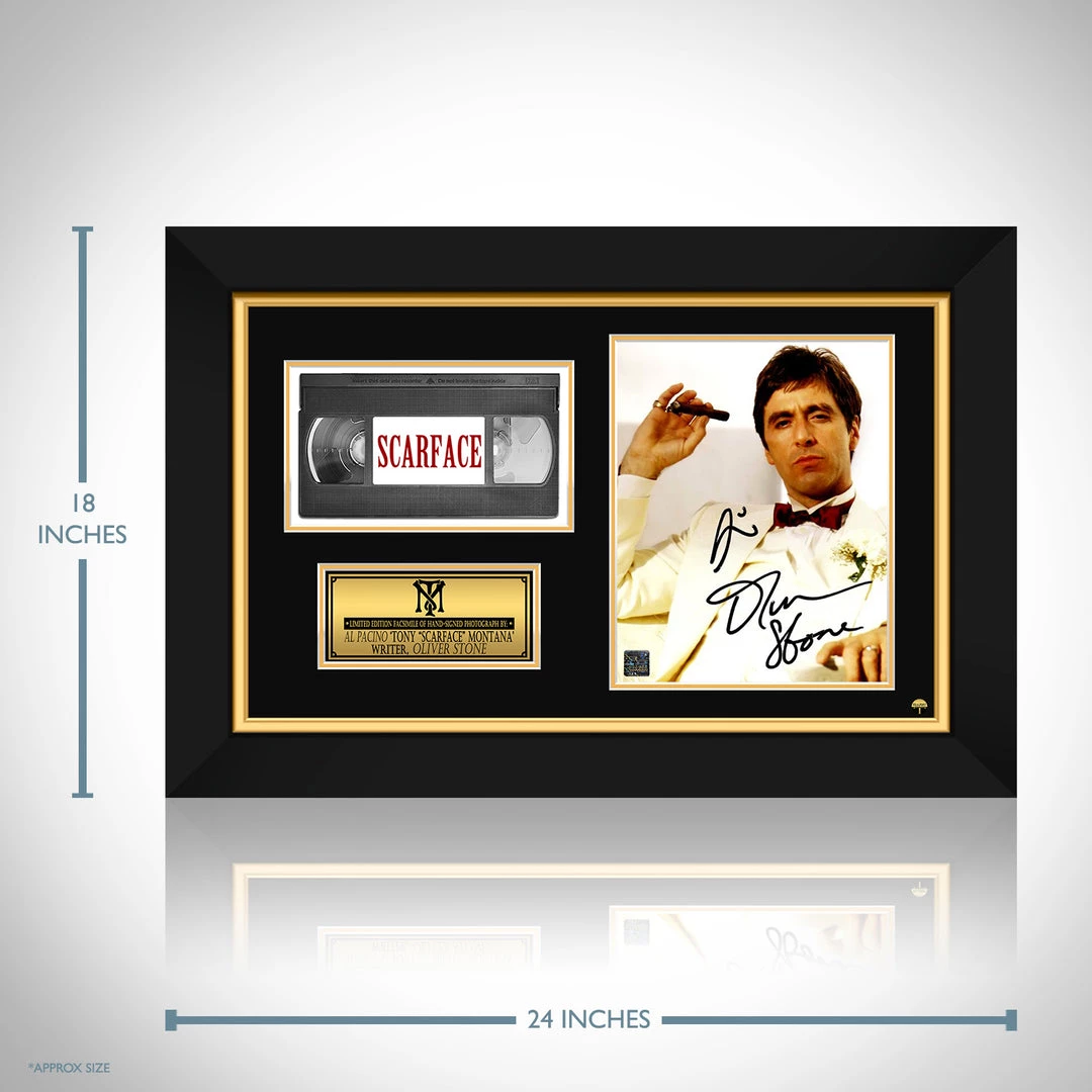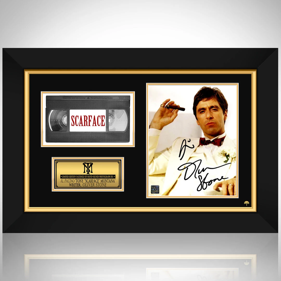 Pay homage to the iconic mobster Tony Montana and one of the most greatest and most influential movies of all time, Scarface, with this gallery-framed, officially licensed, limited edition facsimile of hand-signed movie photo & VHS , originally signed by legendary actor, filmmaker Al Pacino and director, screenwriter and producer Oliver Stone, of which is strictly limited to 100 units Worldwide, and has been approved and numbered accordingly.