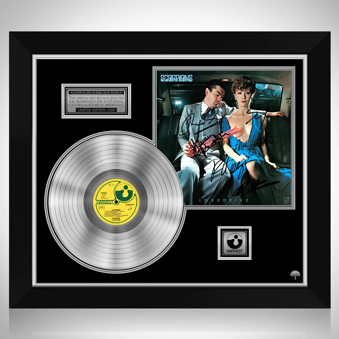 Pay homage to one of the most iconic German band of all time Scorpions , with this gallery-framed, authentic Harvest Records fully licensed facsimile of the official Hand-Signed Platinum Plated LP Record and LP Cover Lovedrive Originally signed by Klaus Meine, Rudolf Schenker, Matthias Jabs, Michael Schenker, Francis Buchholz & Herman Rarebell , of which is strictly limited to 100 units Worldwide and has been approved and numbered accordingly.