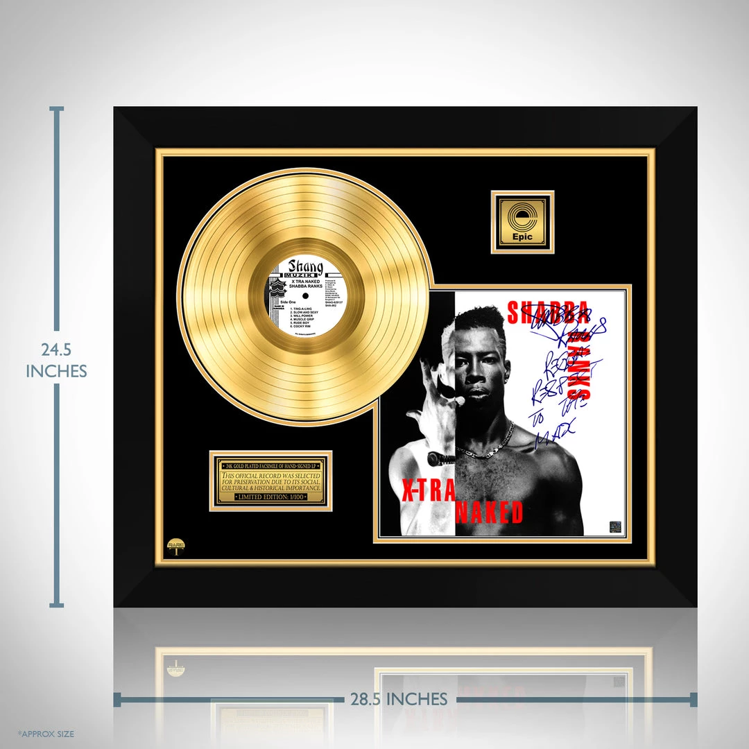 Pay homage to one of the most iconic Jamaican dancehall musician of all time Shabba Ranks , with this gallery-framed, authentic Epic Records fully licensed facsimile of the official Hand-Signed 24K Gold LP Record and LP Cover X-tra Naked Originally signed by Shabba Ranks , of which is strictly limited to 100 units Worldwide and has been approved and numbered accordingly.