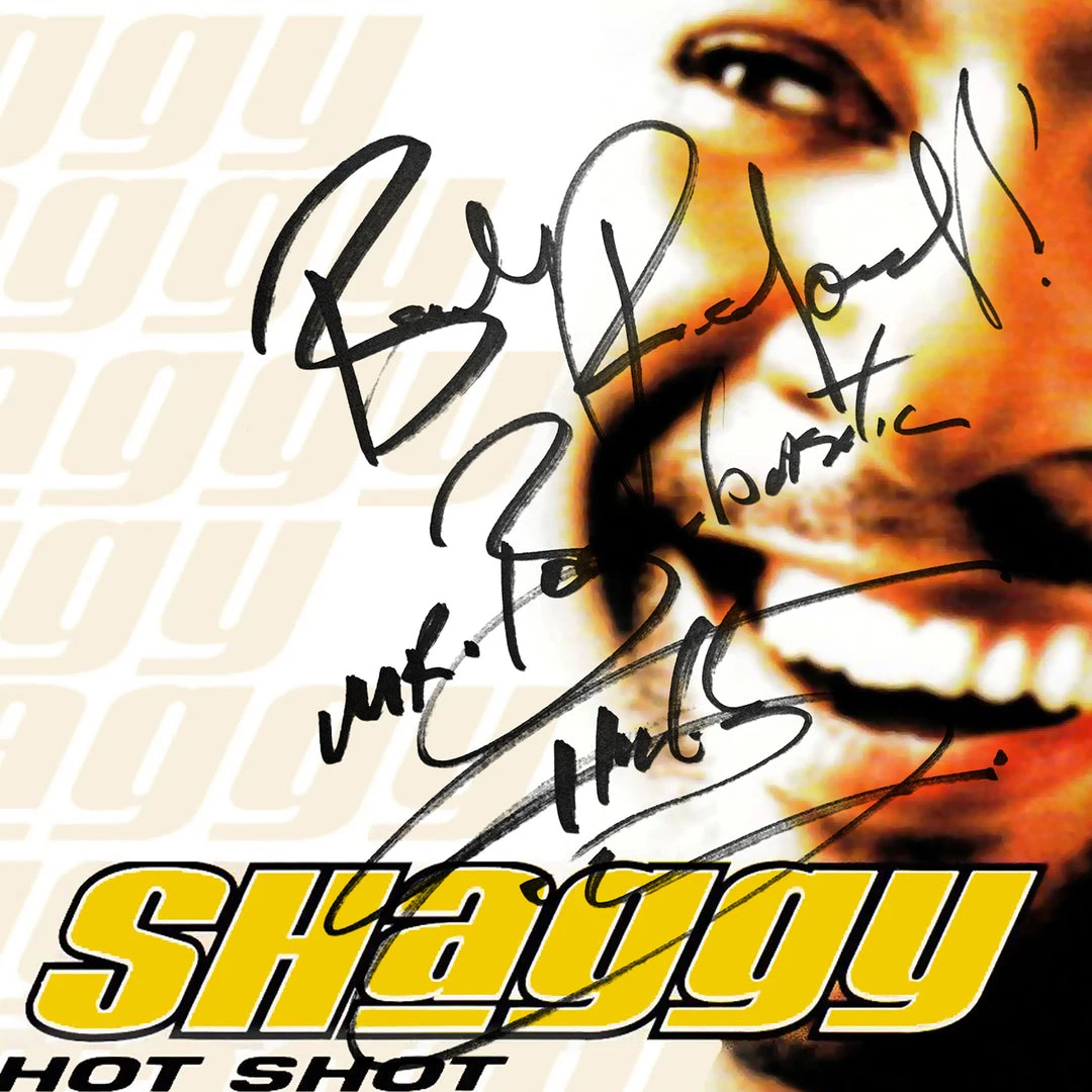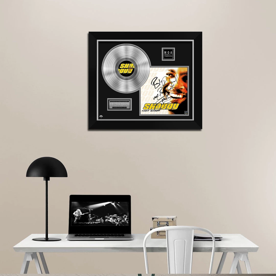 Pay homage to one of the most iconic Jamaican reggae musician Singer of all time Shaggy , with this gallery-framed, authentic MCA Records fully licensed facsimile of the official Hand-Signed Platinum Plated LP Record and LP Cover Hot Shot Originally signed by Shaggy , of which is strictly limited to 100 units Worldwide and has been approved and numbered accordingly.