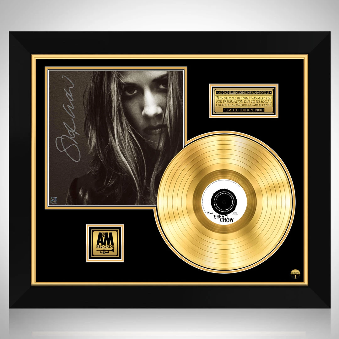 Pay homage to one of the most iconic American musician, singer, songwriter, actress of all time Sheryl Crow , with this gallery-framed, authentic A&M Records fully licensed facsimile of the official Hand-Signed 24K Gold LP Record and LP Cover Selt-titled Originally signed by Sheryl Crow , of which is strictly limited to 100 units Worldwide and has been approved and numbered accordingly.