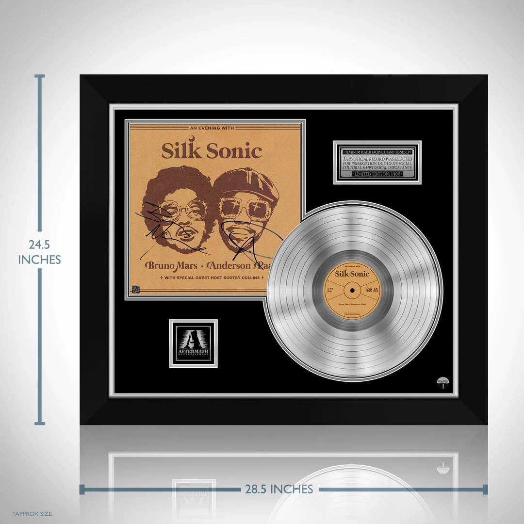Pay homage to one of the most iconic of all time Silk Sonic , with this gallery-framed, authentic Atlantic Records fully licensed facsimile of the official Hand-Signed Platinum Plated LP Record and LP Cover An Evening with Originally signed by Bruno Mars & Anderson .Paak , of which is strictly limited to 100 units Worldwide and has been approved and numbered accordingly.