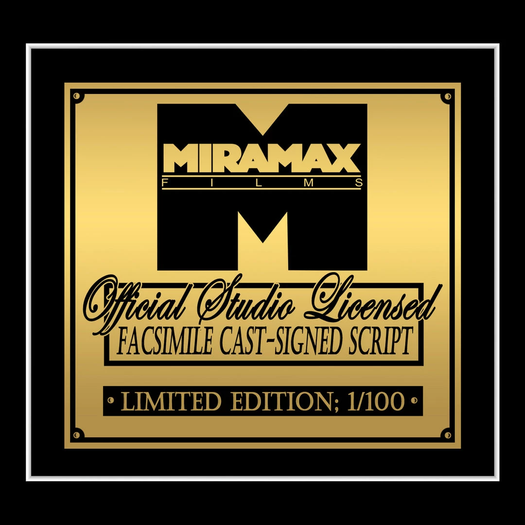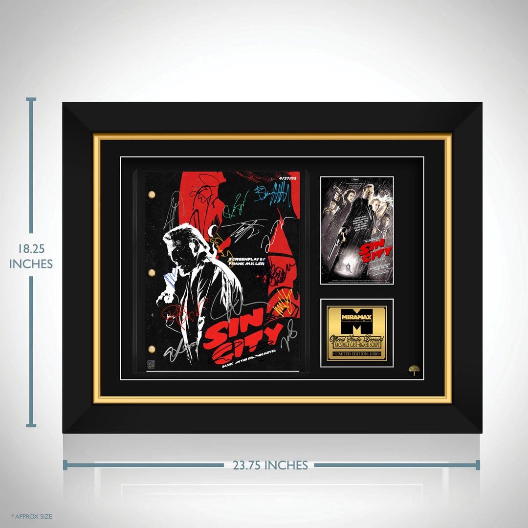 Pay homage to Sin city , with this Miramax Films fully licensed facsimile of the official signed movie script, originally signed by actors Quentin Tarantino, Jessica Alba, Rosario Dawson, Benicio Del Toro, Michael Clarke Duncan, Tommy Flanagan, Josh Hartnett, Michael Madsen, Clive Owen, Mickey Rourke, Nick Stahl, Bruce Willis, Elijah Wood, Robert Rodriguez & Frank Miller , of which is strictly limited to 100 units Worldwide and has been approved and numbered accordingly.