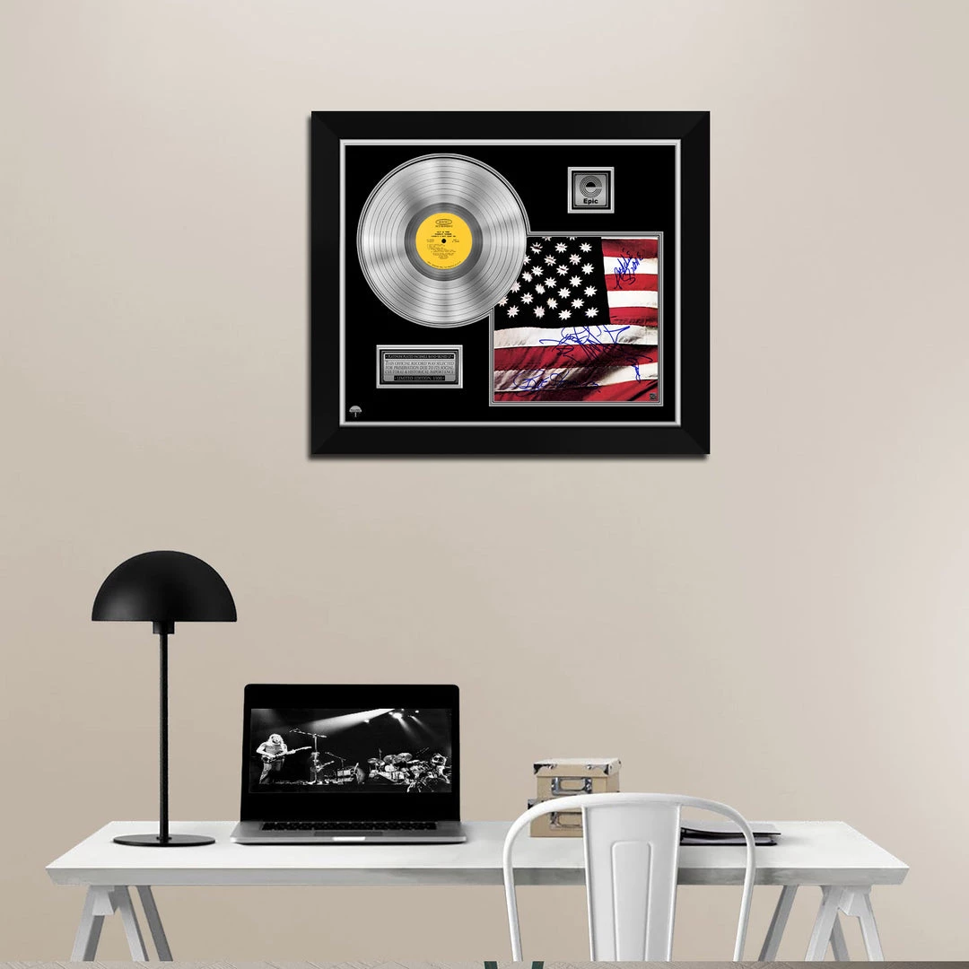 The Platinum Plated LP and album cover facsimile are both professionally mounted in the highest quality triple matted wood shadow box frame with metallic fillet trim and finished with protective glass to keep it looking pristine. The customized descriptive metallic plaque, in addition to the detailed finishing and openings, add to the elegant and sophisticated gallery quality look.