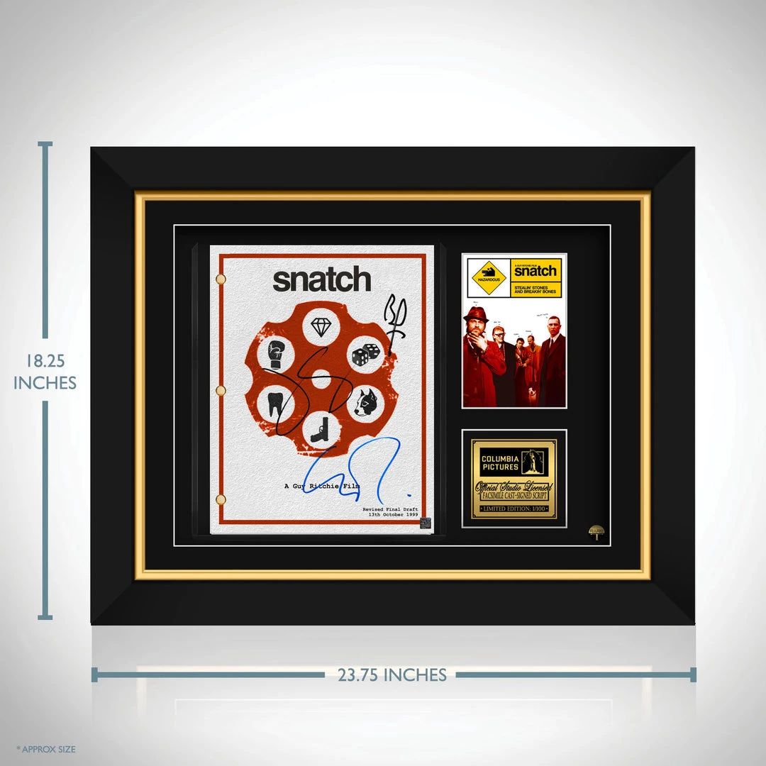 Pay homage to Snatch , with this Columbia Pictures fully licensed facsimile of the official signed Movie script, originally signed by actors Brad Pitt, Jason Statham & Guy Ritchie , of which is strictly limited to 100 units Worldwide and has been approved and numbered accordingly.