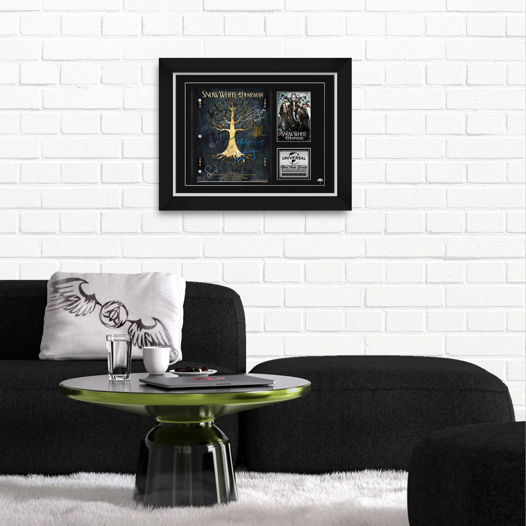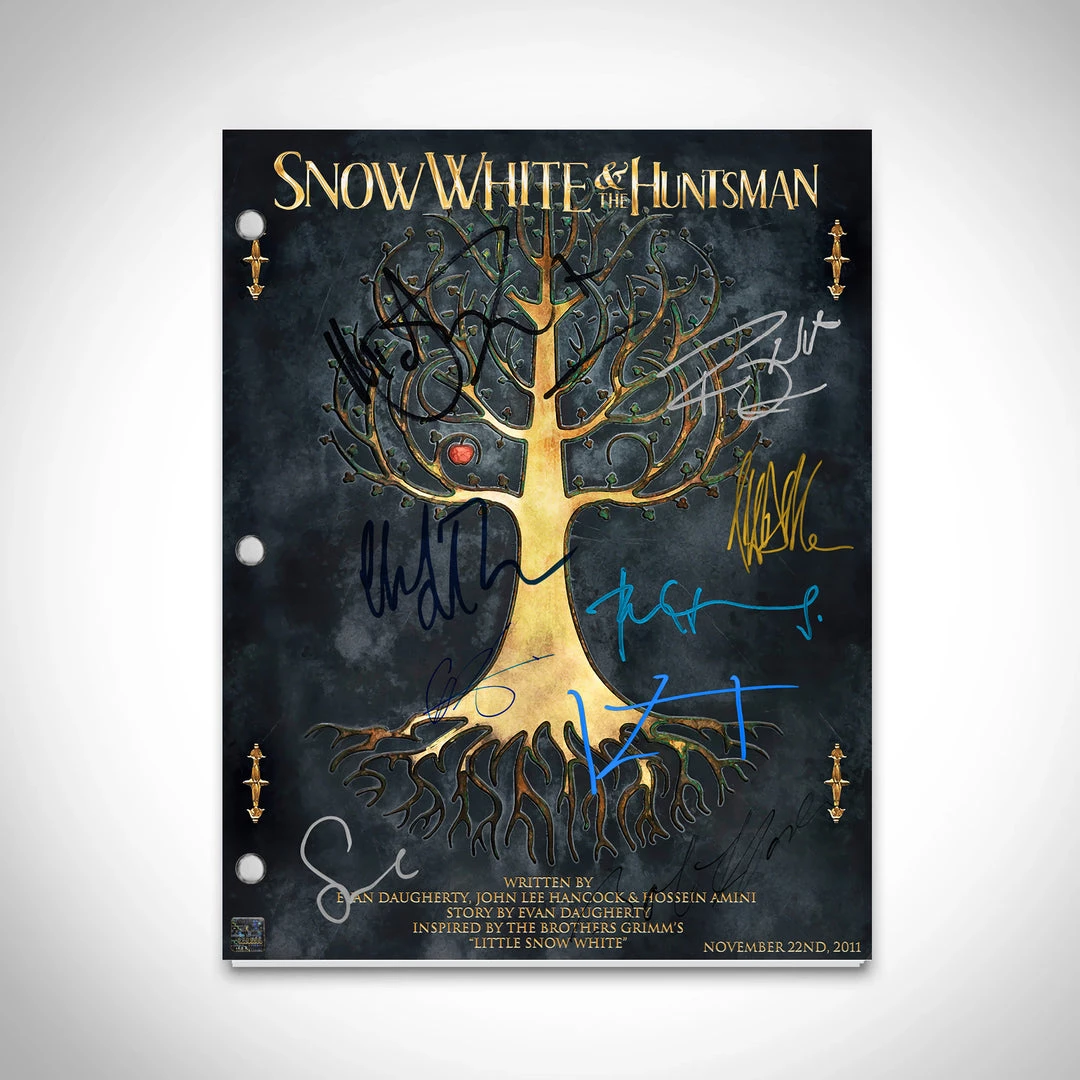 Pay homage to Snow White & the Huntsman , with this Universal Pictures fully licensed facsimile of the official signed movie script, originally signed by actors Kristen Stewart, Charlize Theron, Chris Hemsworth, Sam Claflin, Ian McShane, Bon Hoskins, Ray Winstone, Nick Frost & Toby Jones , of which is strictly limited to 100 units Worldwide and has been approved and numbered accordingly.