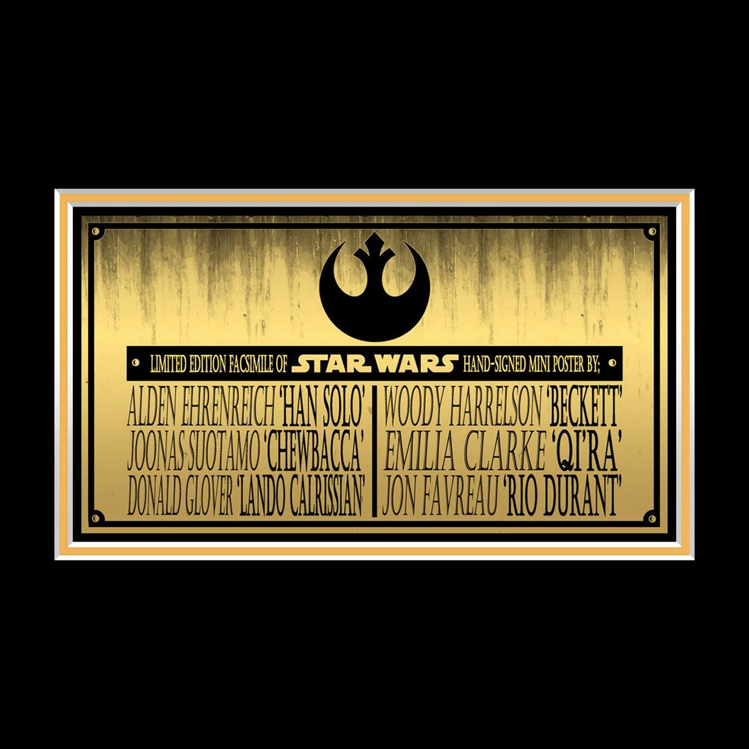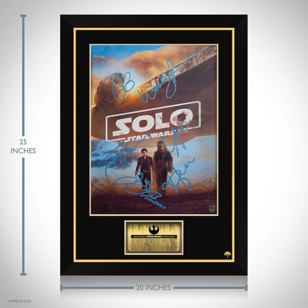 Pay homage to Solo : A Star Wars Story with this gallery-framed, officially licensed, limited edition facsimile of hand-signed mini poster, originally signed by  legendary actors Alden Ehrenreich, Joonas Suotamo, Donald Glover, Woody Harrelson, Emilia Clarke & Jon Favreau., of which is strictly limited to 100 units Worldwide, and has been approved and numbered accordingly.