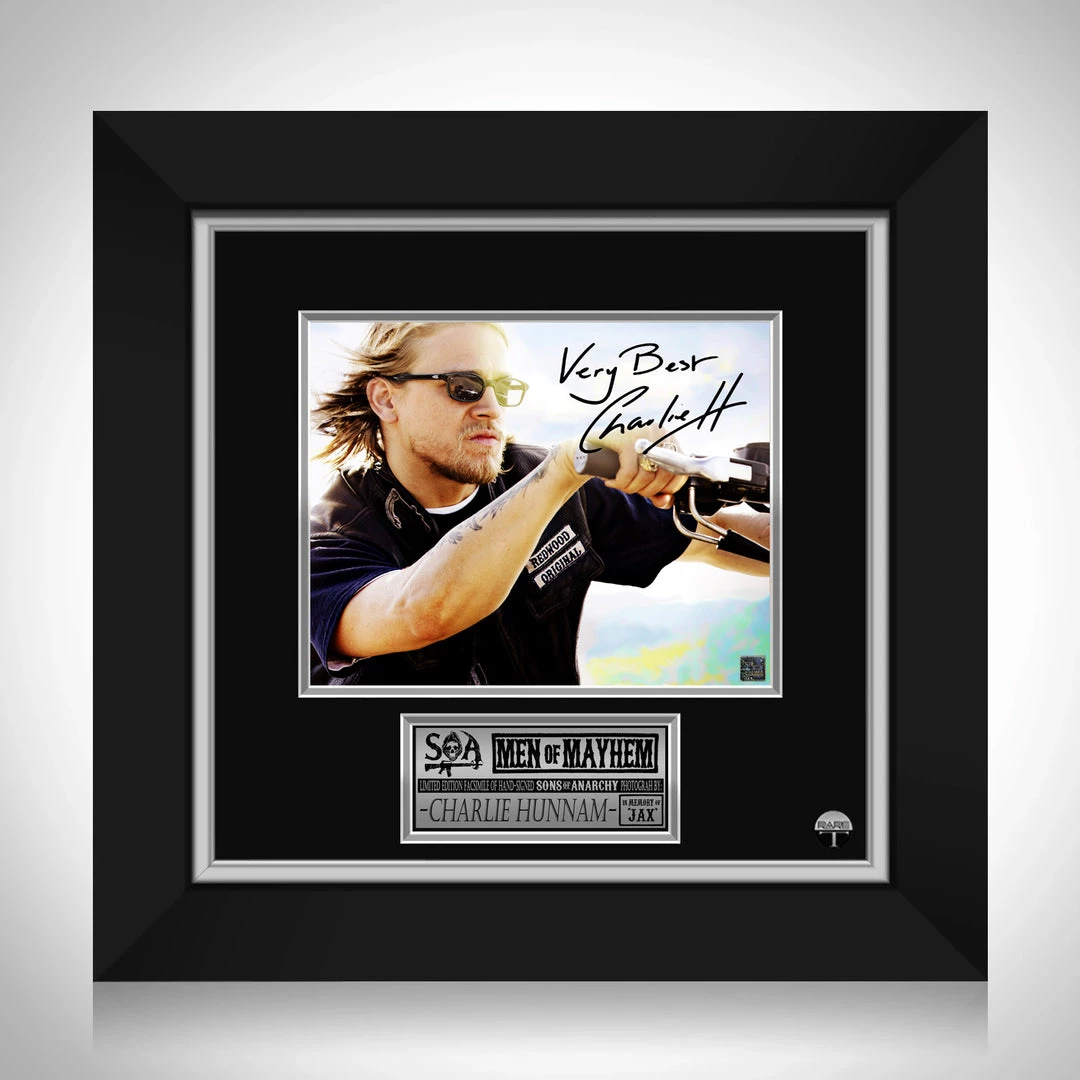 Pay homage to Jax Teller and one of the most iconic and influential award winning TV dramas of all time, Sons of Anarchy, with this gallery-framed, officially licensed, limited edition facsimile of hand-signed photo of Jax Teller on his bike, originally signed by actor Charlie Hunnam, of which is strictly limited to 100 units Worldwide, and has been approved and numbered accordingly.
