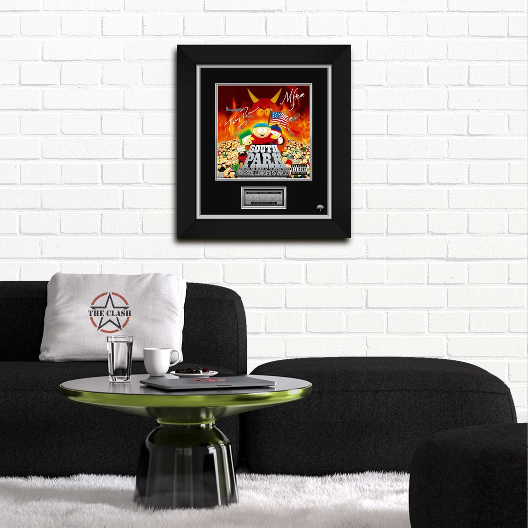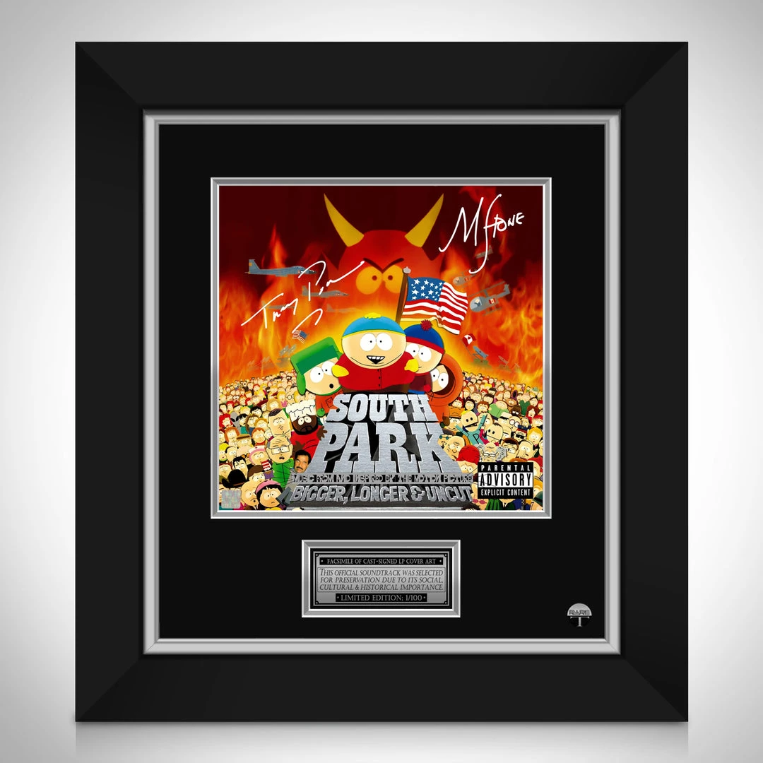 Pay homage to the highest-grossing R-rated animated film of all time, South Park BIGGER, LONGER & UNCUT, with this gallery-framed, officially licensed, limited edition facsimile of the Hand-Signed South Park BIGGER, LONGER & UNCUT Soundtrack LP Cover, originally signed by Trey Parker & Matt Stone, of which is strictly limited to 100 units Worldwide, and has been approved and numbered accordingly.