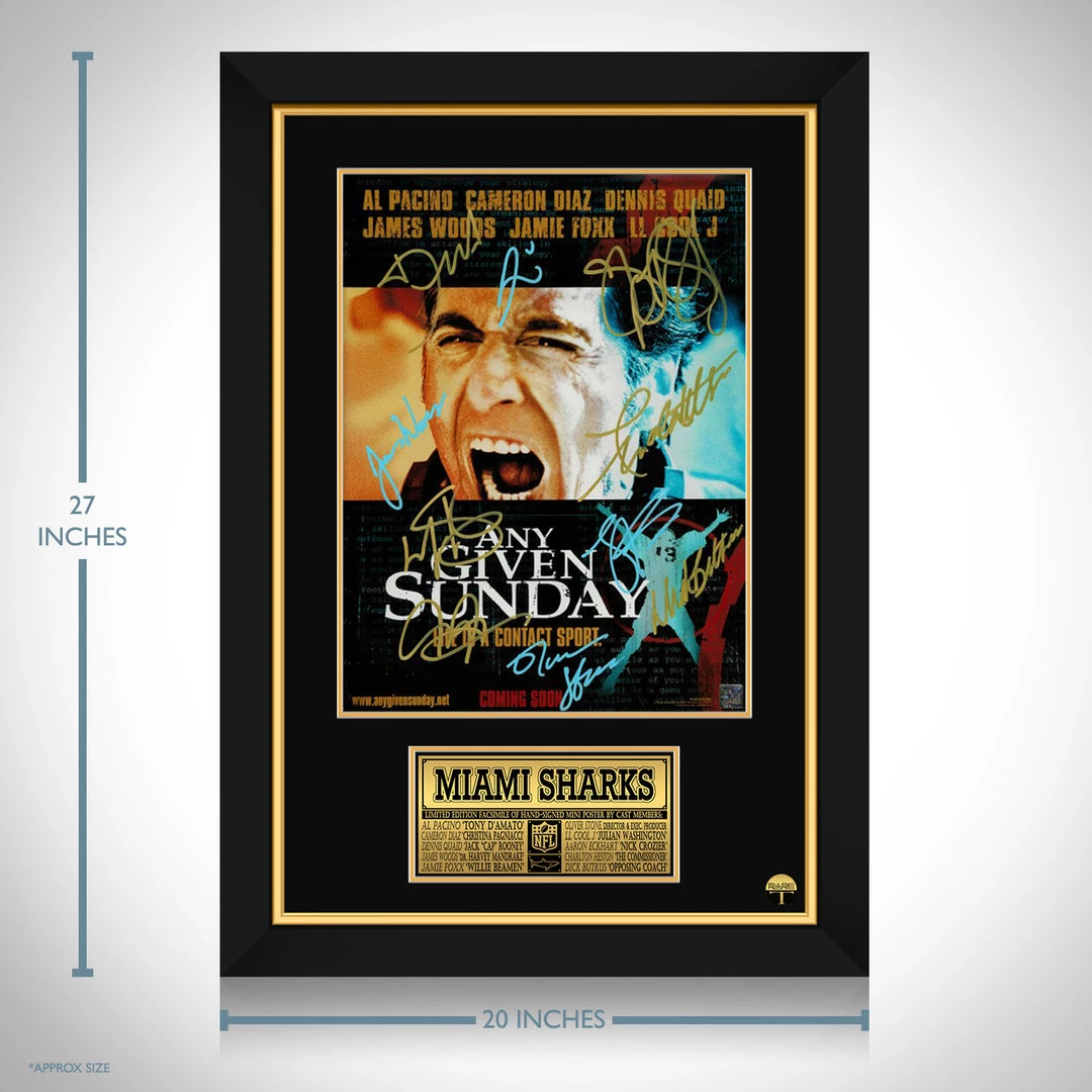 Pay homage to one of the most iconic sports masterpieces, Any Given Sunday, with this gallery-framed, officially licensed, limited edition facsimile of the official Hand-Signed mini poster, originally signed by Al Pacino, Cameron Diaz, Dennis Quaid, LL Cool J, James Woods, Charlton Heston, Jamie Foxx, Aaron Eckhart and by legendary director Oliver Stone, of which is strictly limited to 100 units Worldwide, and has been approved and numbered accordingly.