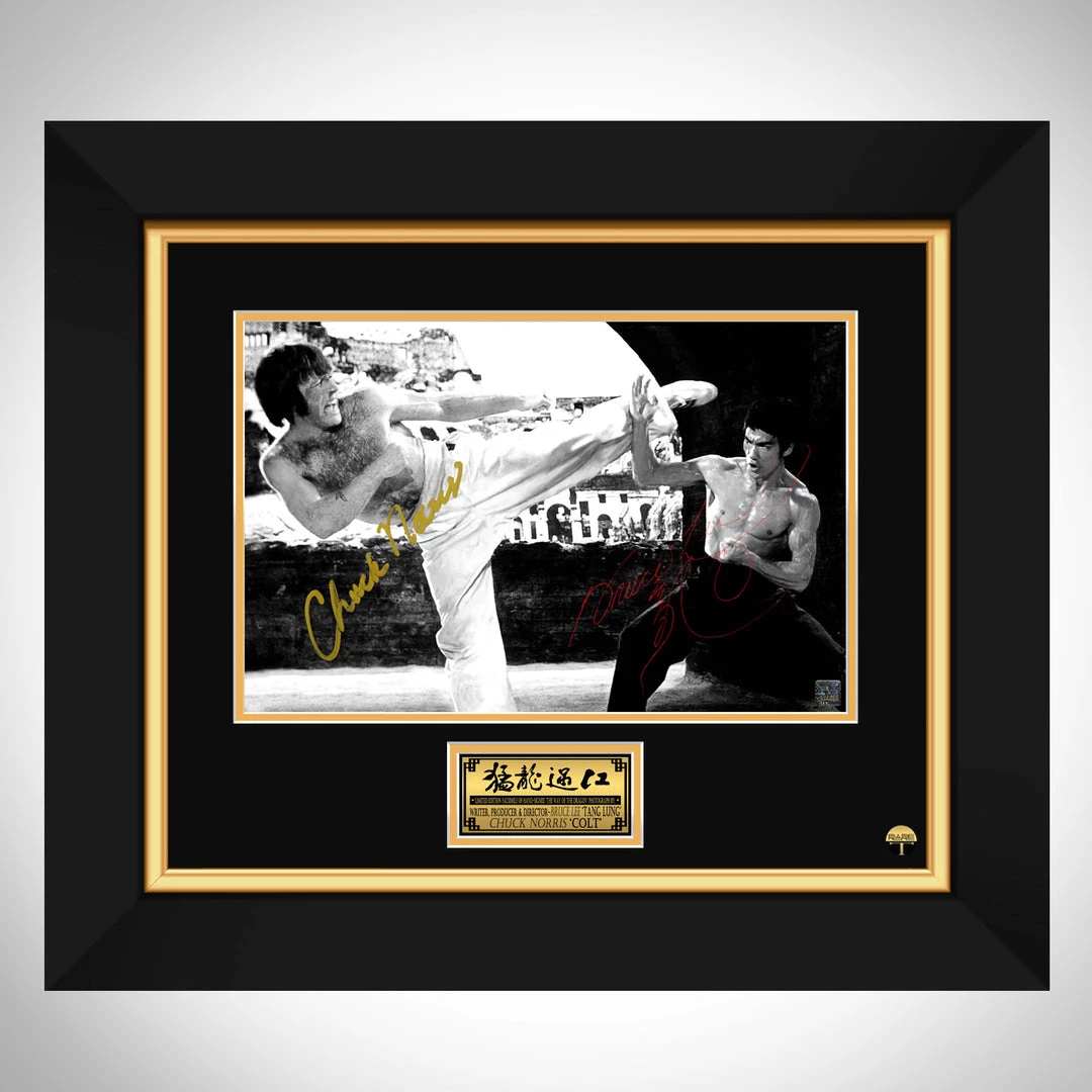 Pay homage to Colt and one of the most iconic martial arts films of all time, The Way of the Dragon, written, produced and directed by the late Martial Arts legend Bruce Lee, this is the film that started Chuck Norris’s career, being his debut screen role, with this gallery-framed, officially licensed, limited edition facsimile of hand-signed movie promotional art photo, originally signed by actor, Chuck Norris & Bruce Lee, of which is strictly limited to 100 units Worldwide, and has been approved and numbered accordingly.