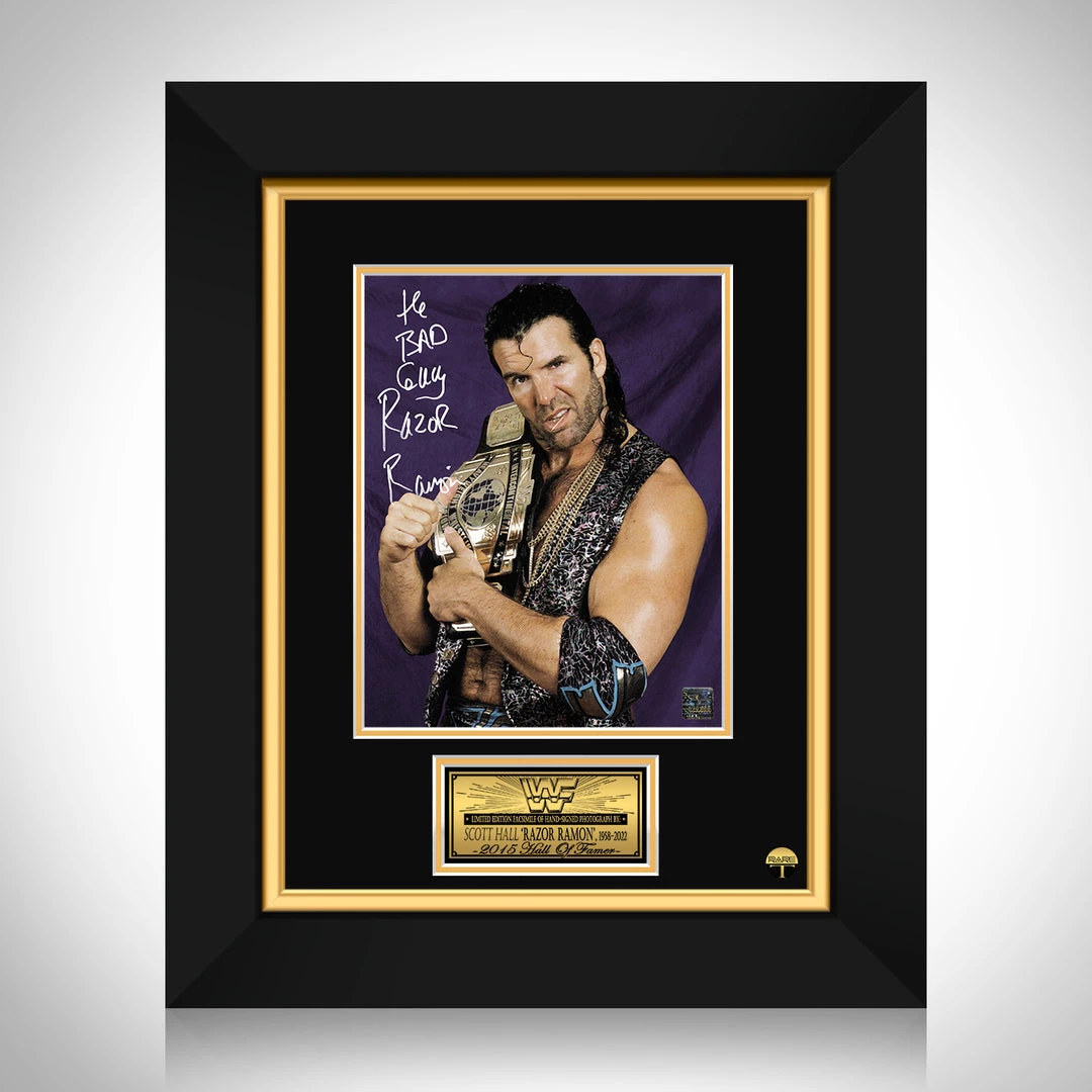 Pay homage to Razor Ramone, with this gallery-framed, officially licensed, limited edition facsimile of the Hand-Signed photo, originally signed by Scott Hall, of which is strictly limited to 100 units Worldwide, and has been approved and numbered accordingly.