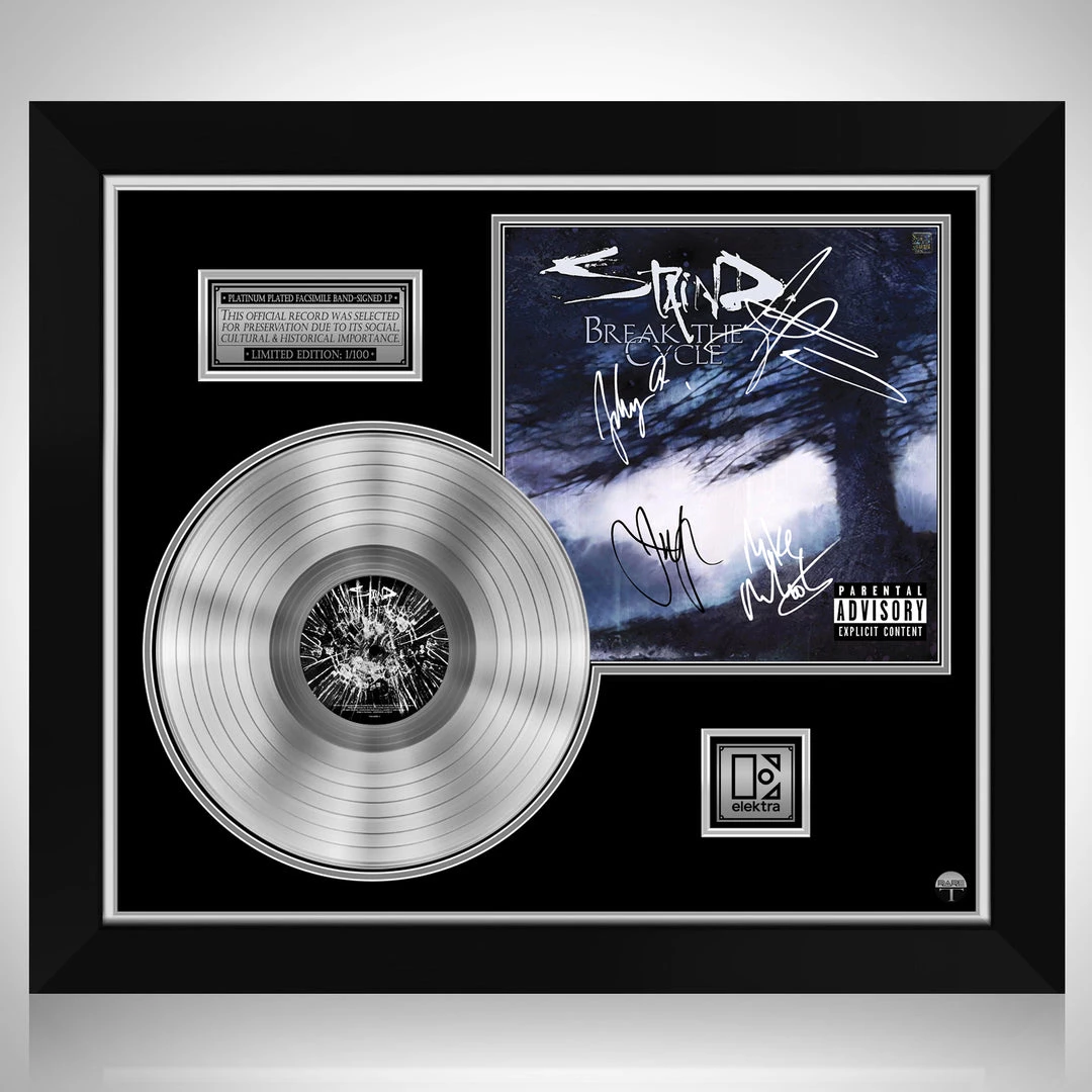 Pay homage to one of the most iconic American rock band of all time Staind , with this gallery-framed, authentic Elecktra Records fully licensed facsimile of the official Hand-Signed Platinum Plated LP Record and LP Cover Break the cycle Originally signed by Aaron Lewis, Mike Mushok, Johnny April, Jon Wysocki, , of which is strictly limited to 100 units Worldwide and has been approved and numbered accordingly.