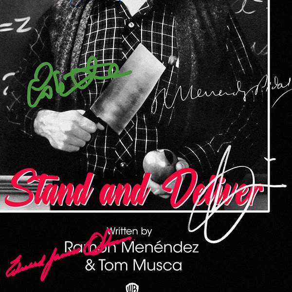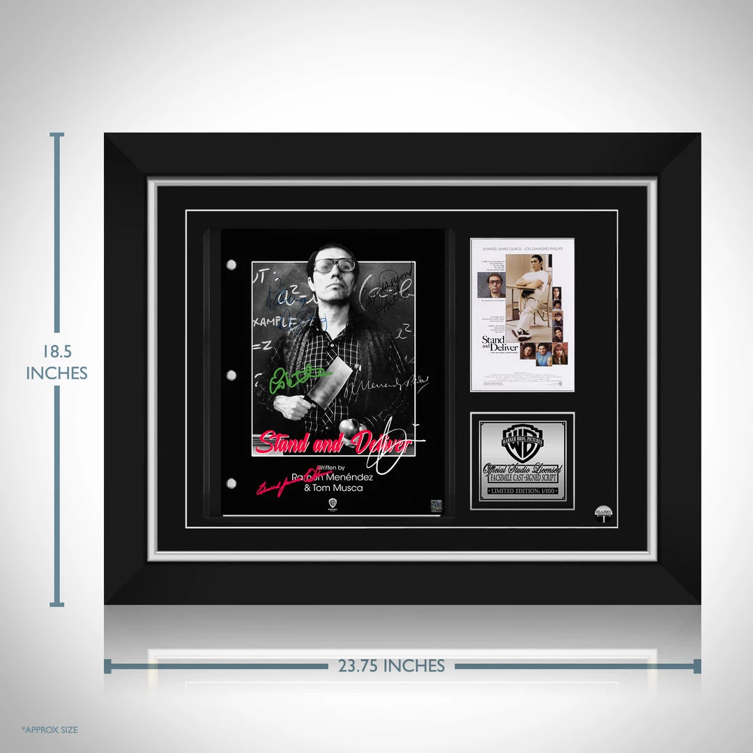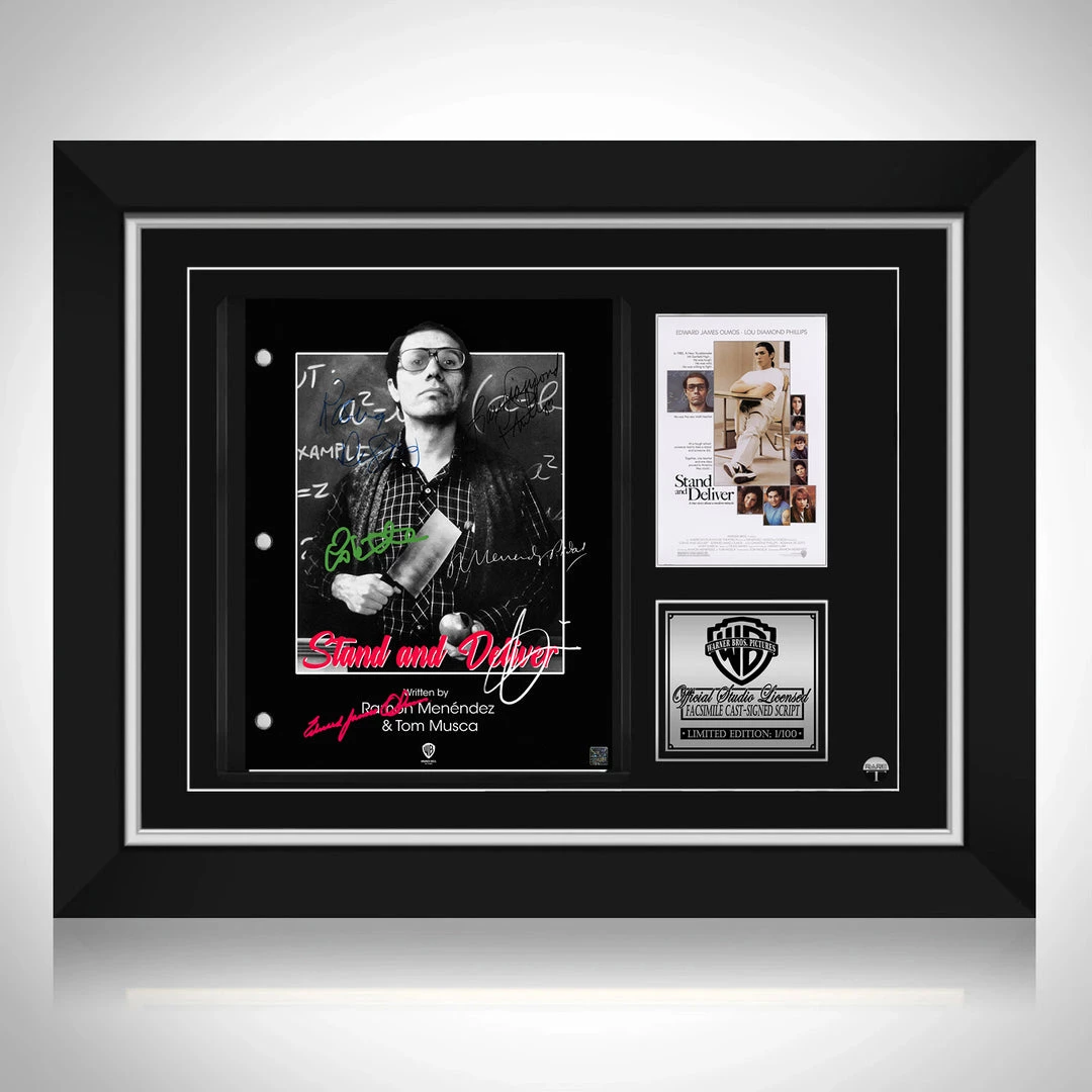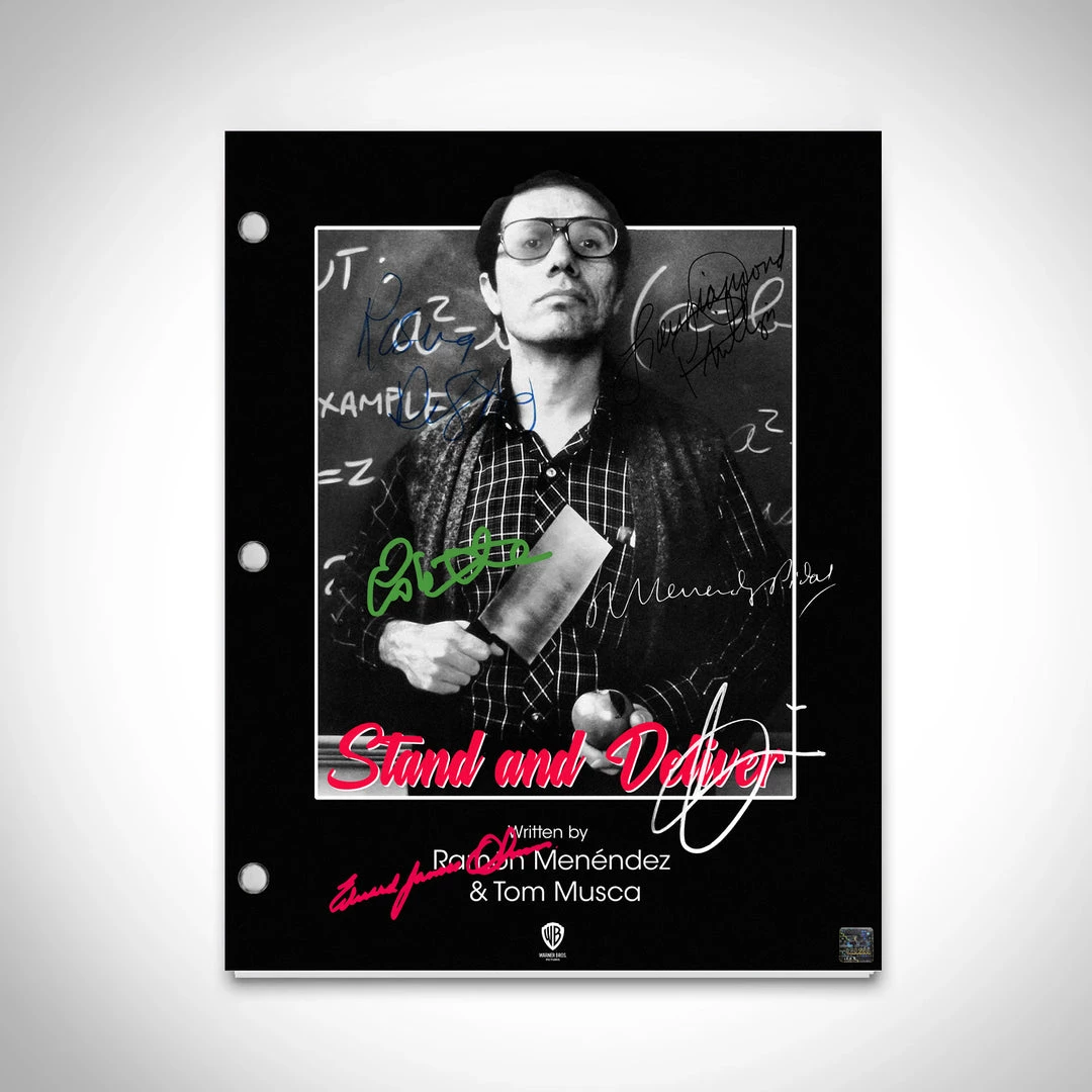 Pay homage to Stand and Deliver , with this Warner Bros. Pictures fully licensed facsimile of the official signed movie Transcript , originally signed by actors Edward James Olmos, Lou Diamond Phillips, Rosanna DeSoto, Andy Garcia, Estelle Harris & Ramón Menéndez , of which is strictly limited to 100 units Worldwide and has been approved and numbered accordingly.